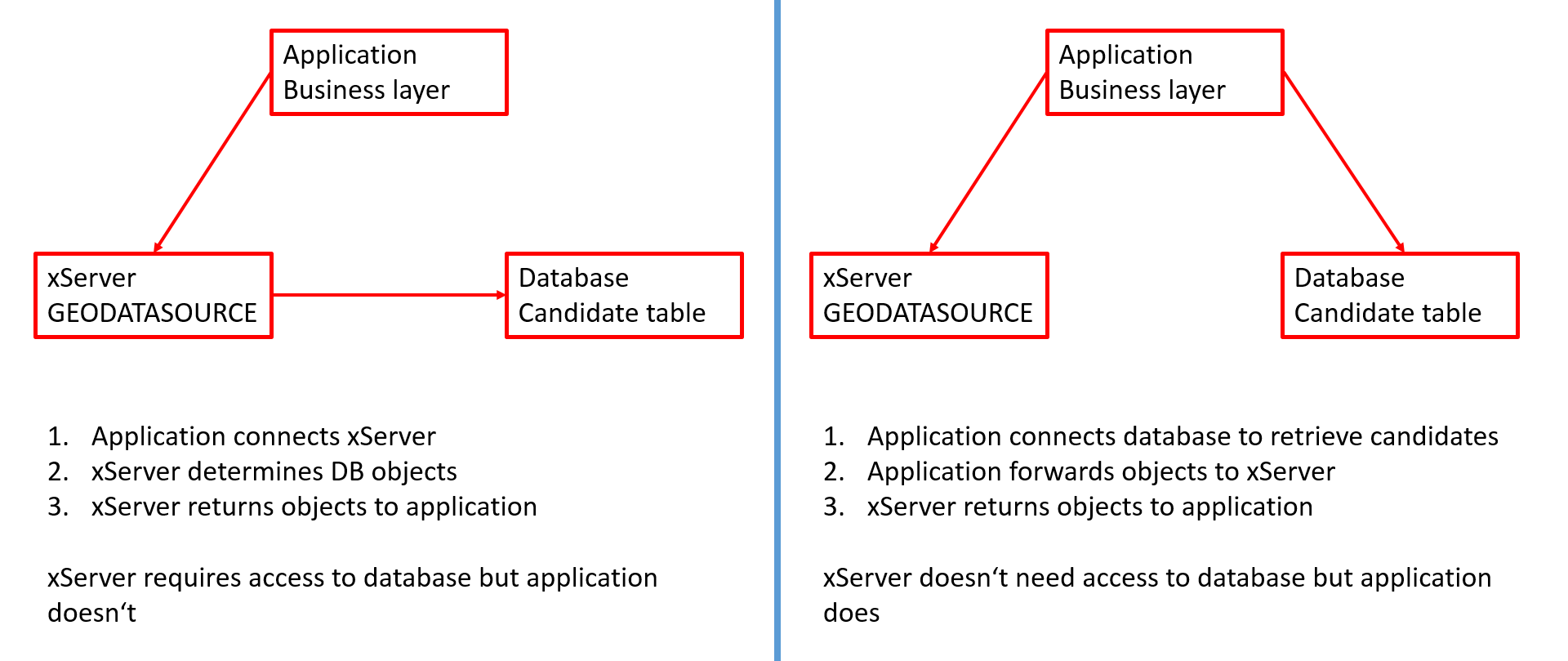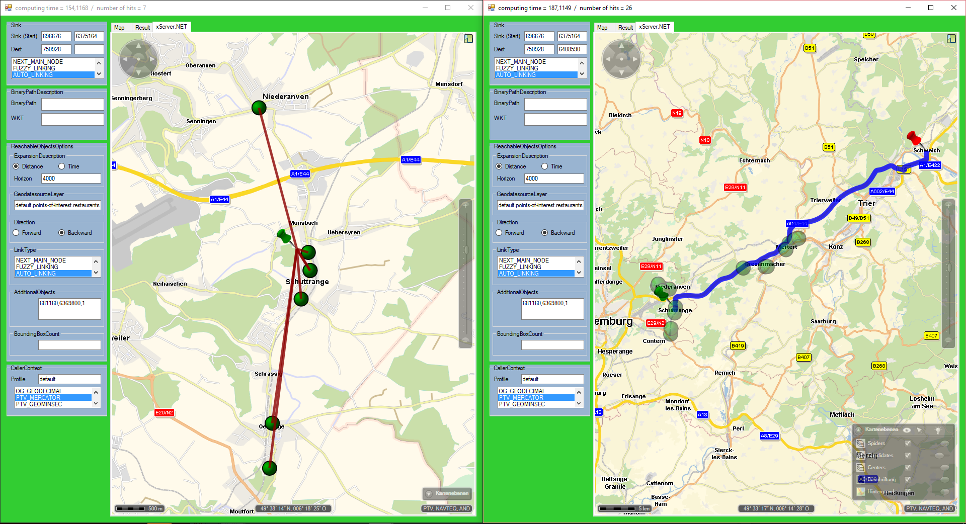 • Are the candidates (static) objects stored in a database? If this is the case the geodatabase search of xRoute could provide quick access to the search: the xRoute itself connects to the database in the backend and determines those objects that are candidates and validates the “hits”. Sometimes the objects could be more context driven which means the application retrieves the x,y-coordinates of objects and forwards them to the xRoute method call.