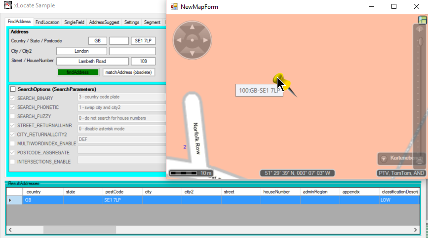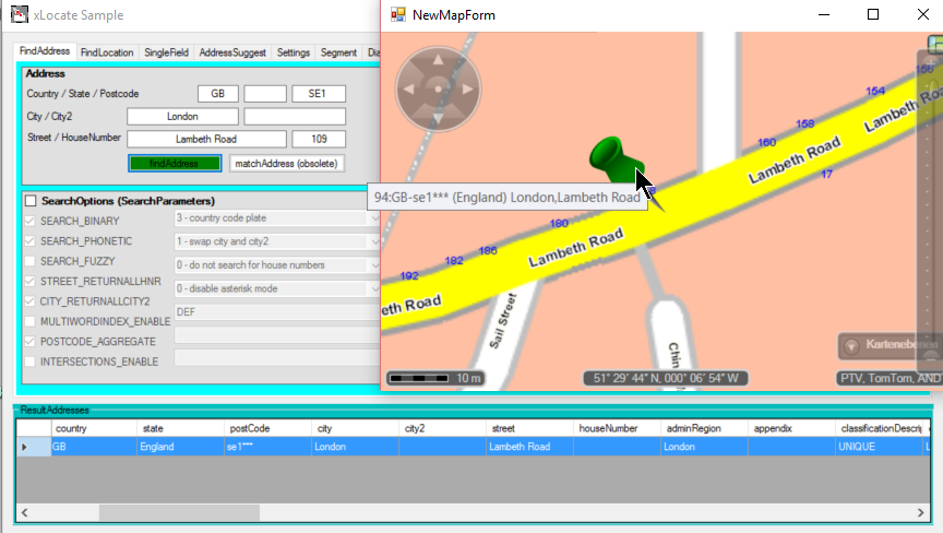 The housenumber "109 Lambeth Road" is assigned to the city Lambeth. If the input is "109 Lambeth Road, SE1 7, London, GB" the xLocate is finding the street directory with the postalcode and the city input. So both are considered to choose the result address.