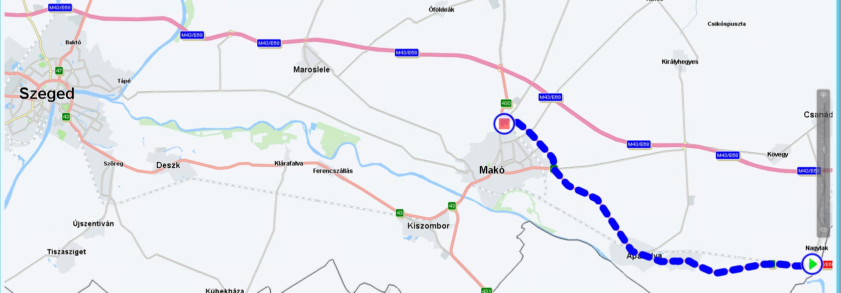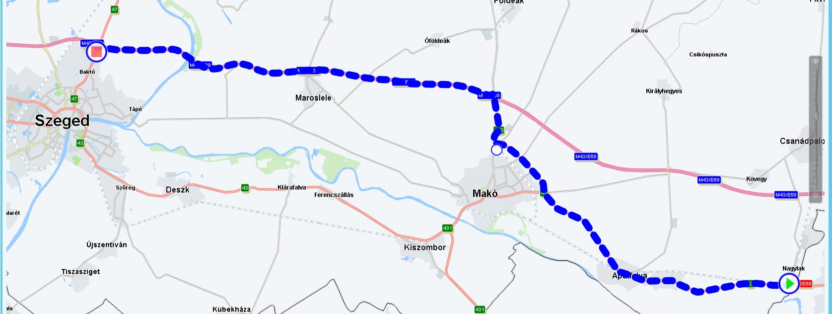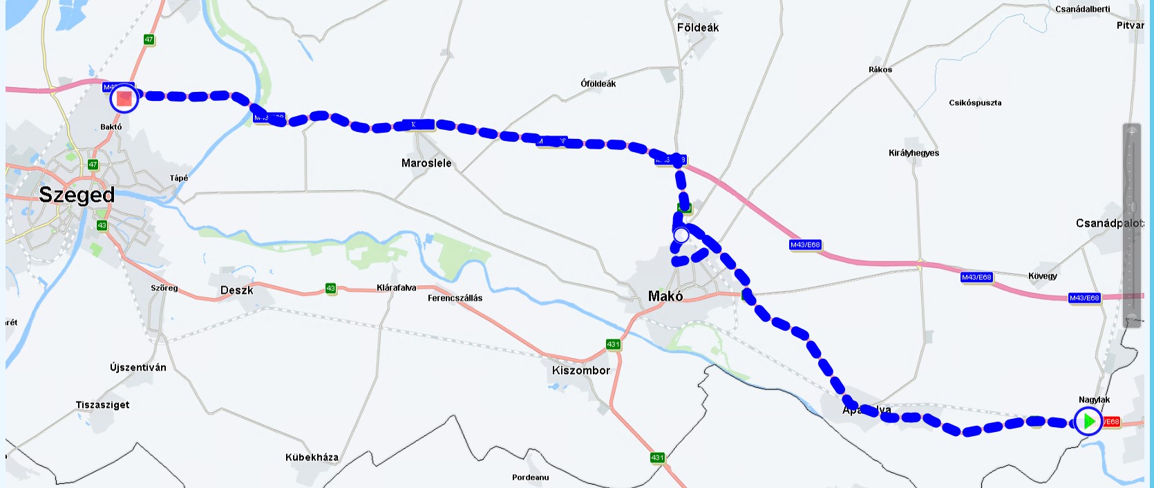 Loading in Nagylak (HU), unloading in Szeged (HU), with one waypoint in Mako (HU).