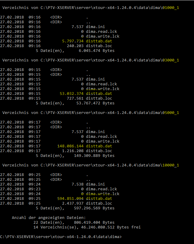 - For the curious ones: if the number of locations involved is higher than e.g. 200 the filespace is dominated by the distance matrix table file as you can compute the space (at least xServer 1) via n² * 6 bytes.