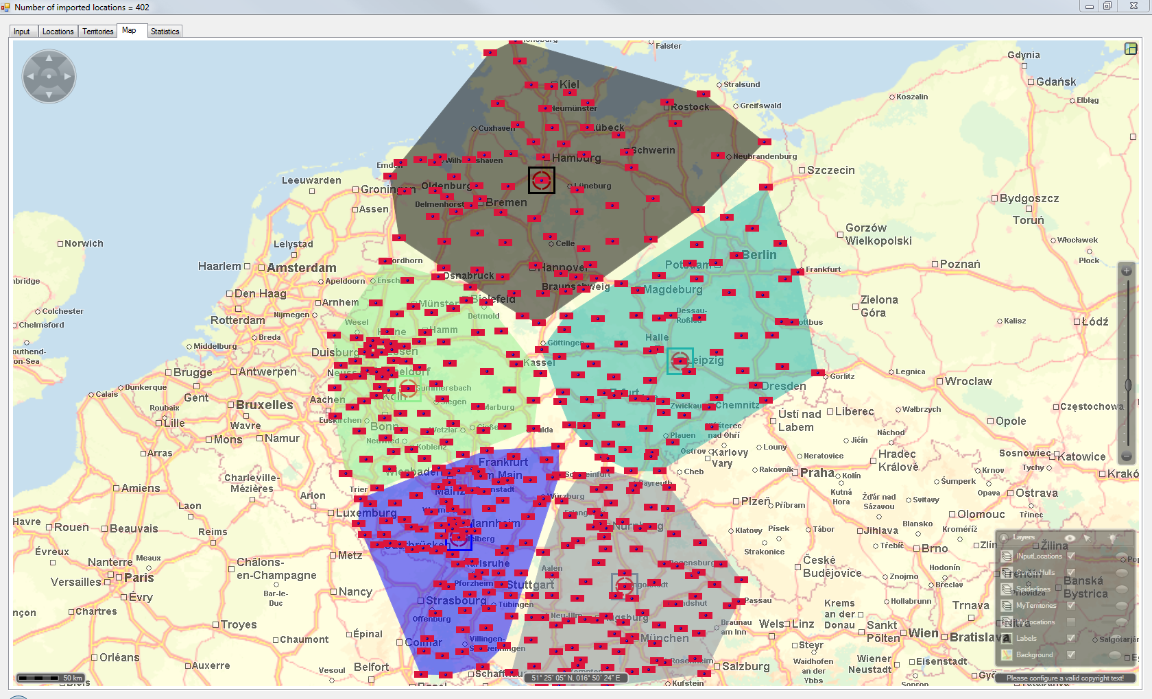 With this final usecase we merge existing subsidaries with potential new subsidaries. I requested a total number of 7 territories and provided 4 existing subsidaries. This is why the statistics mention the known subsidaries and 3 more proposals. Tip: the proposed territory centers are always based on the customer locations