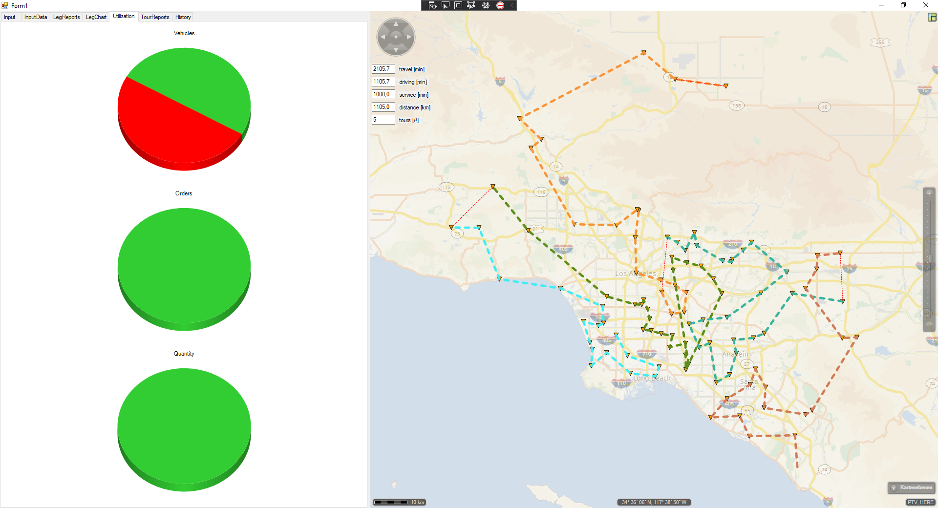 The most important feature in this example is that the engine decides about the assignment of vehicles (depots) to the orders.