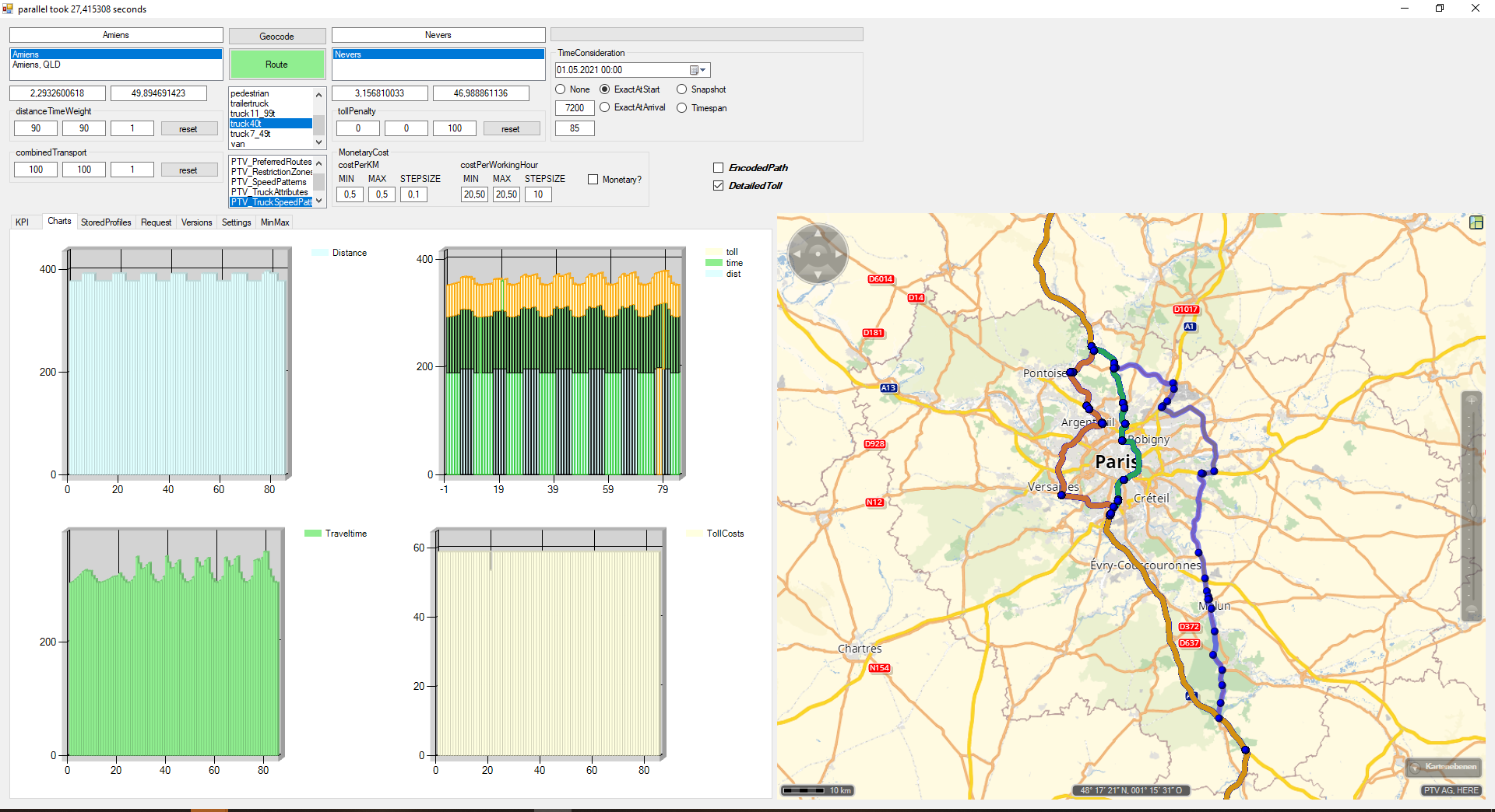 Well, that triggers me to mention the historical speed patterns. IN xRoute2 we also invented the cost optimized routing where we can consider the tarrifs to get the best path Some of our customers use the new (v 2.24 experimental) feature of the energy consumption where lower/higher speeds increase the consumption - by this they expect us to perform detours around inner city regions.since this bypass is usually has less traffic