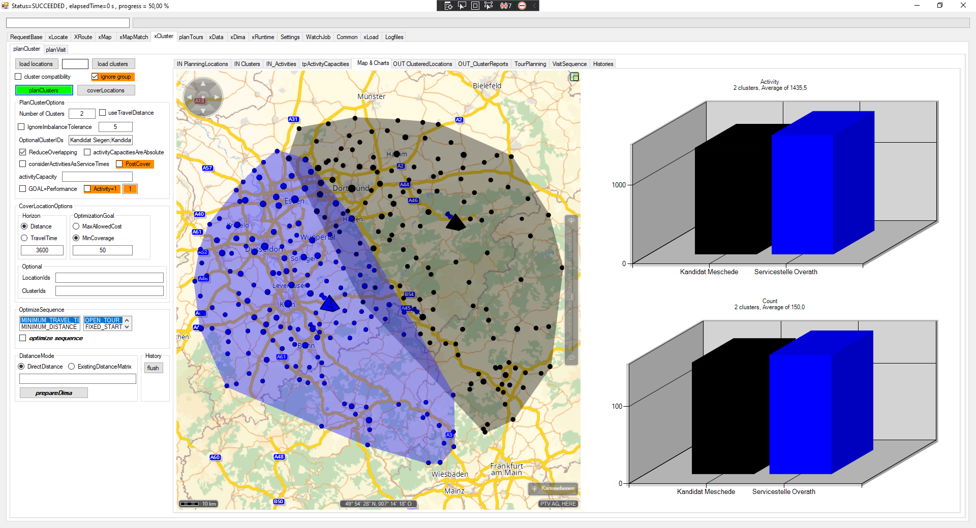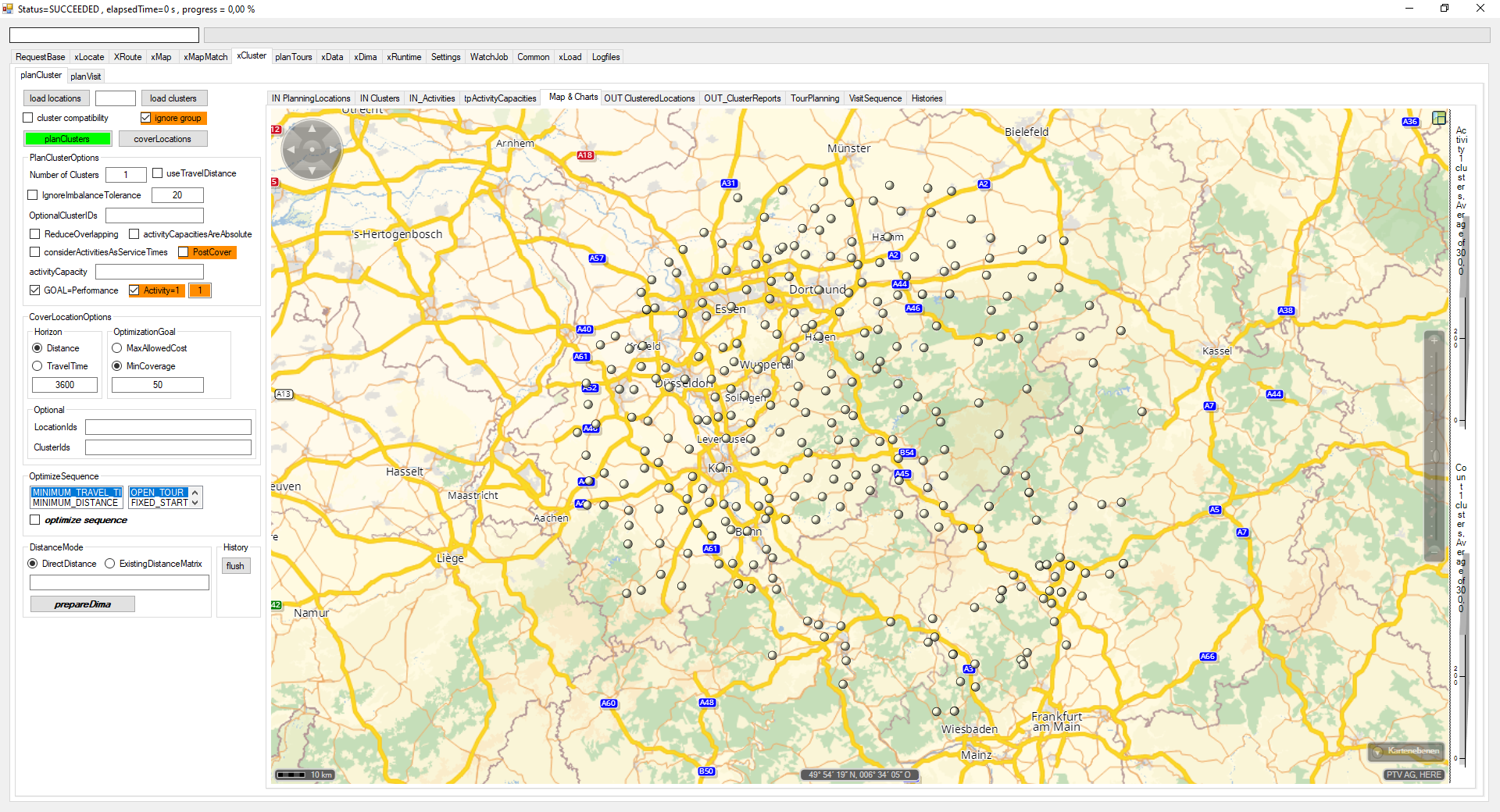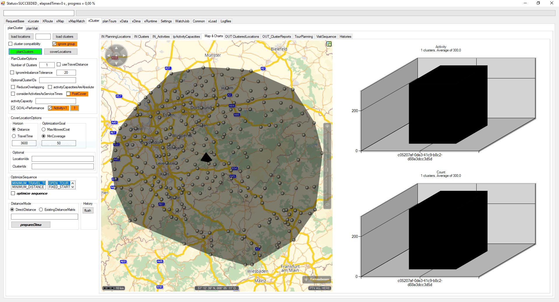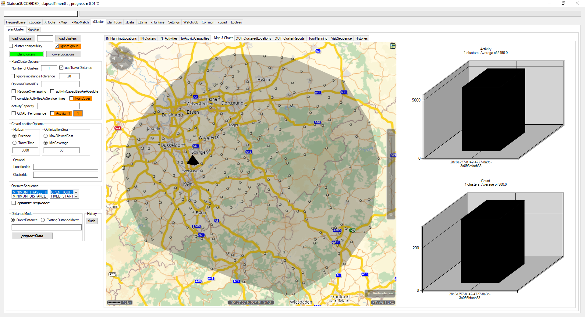 - 300 sample customers located in a specifc region of Germany - the component works fine with thousands or even hundred thousand of objects. The more objects you plan, the longer it takes. It might also require an additional solver called GUROBI.