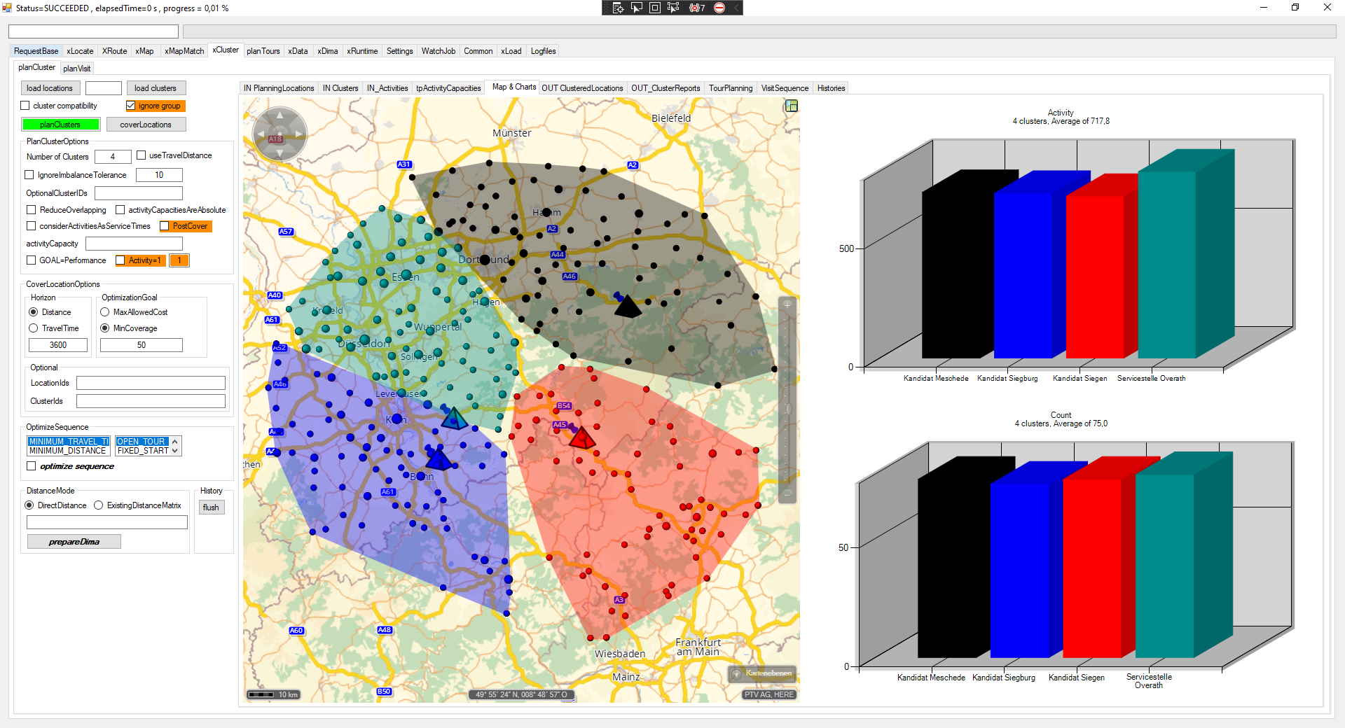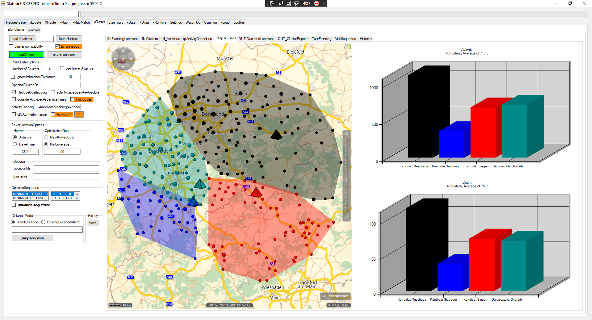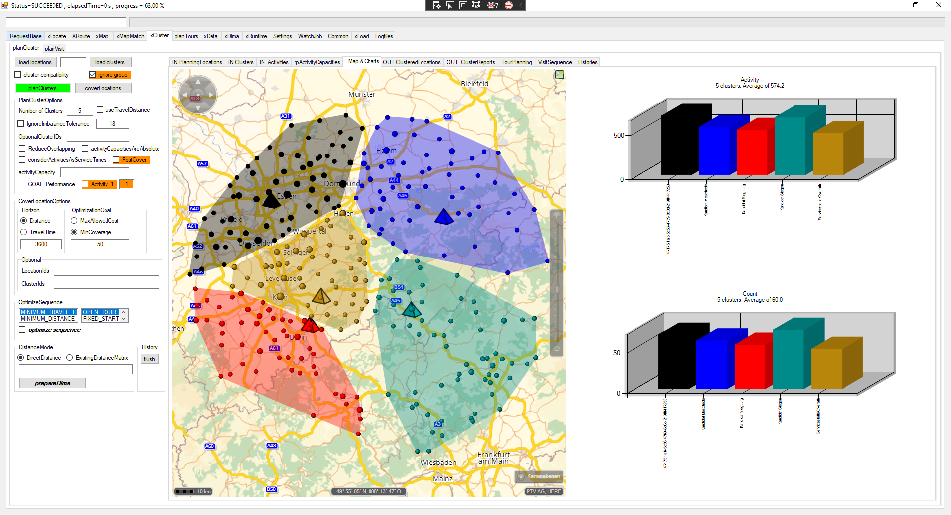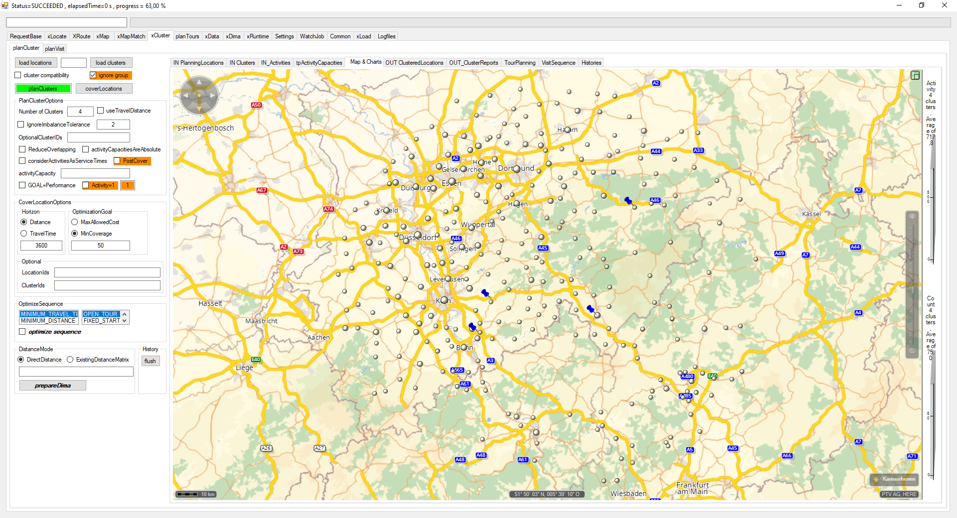- 300 sample customers located in a specifc region of Germany - the component works fine with thousands or even hundred thousand of objects. The more objects you plan, the longer it takes. It might also require an additional solver called GUROBI.