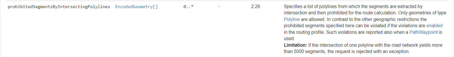 In the meantime I added the com.ptvgroup.xserver.routing.GeographicRestrictions.prohibitedSegmentsByIntersectingPolylines to my testclient. Here's some footage based on the KOSOVO polyline: The sample polyline I gathered was originally based on about 20'000 points which is too much for the API, so I used only every 10th coordinate.