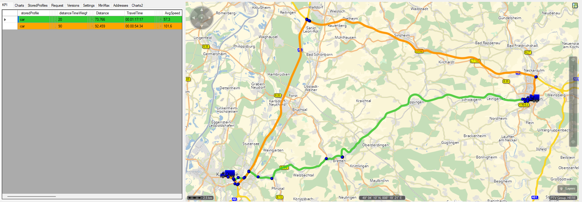 - shortest track (green) is not necessarily the fastest one. While the green track ist 73km andn therefore much shorter than the orange one (93km) the traveltimes are flipped: the green track requires much longer (+20minutes).