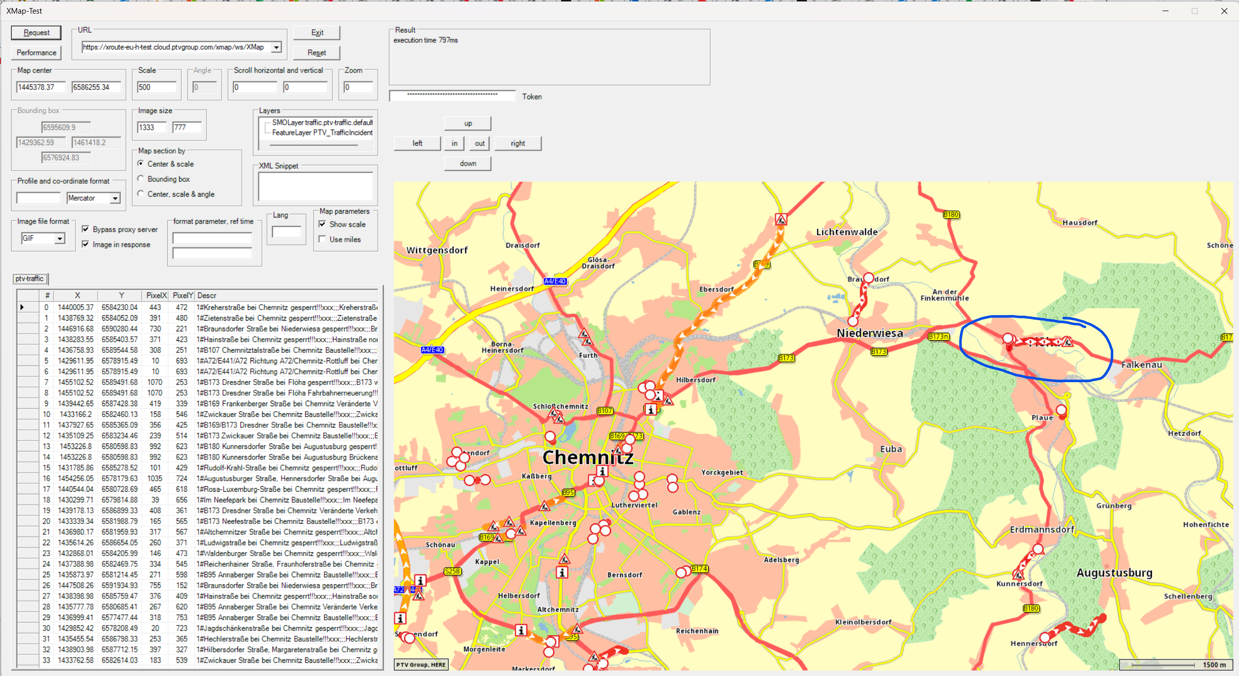 On the raffice map layer, we also visualize this roadblock, however in xServer1 this roadblock is bypassed. I also attached the xServer1 request.