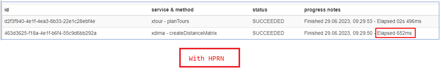 So in this case I`m expecting that the xDima-createDistanceMatrix API call will take the same amount of time as if I was calling it without HPRN (because it doesn`t have the necessary data to make the calculations fast), but instead I do get a fast response.