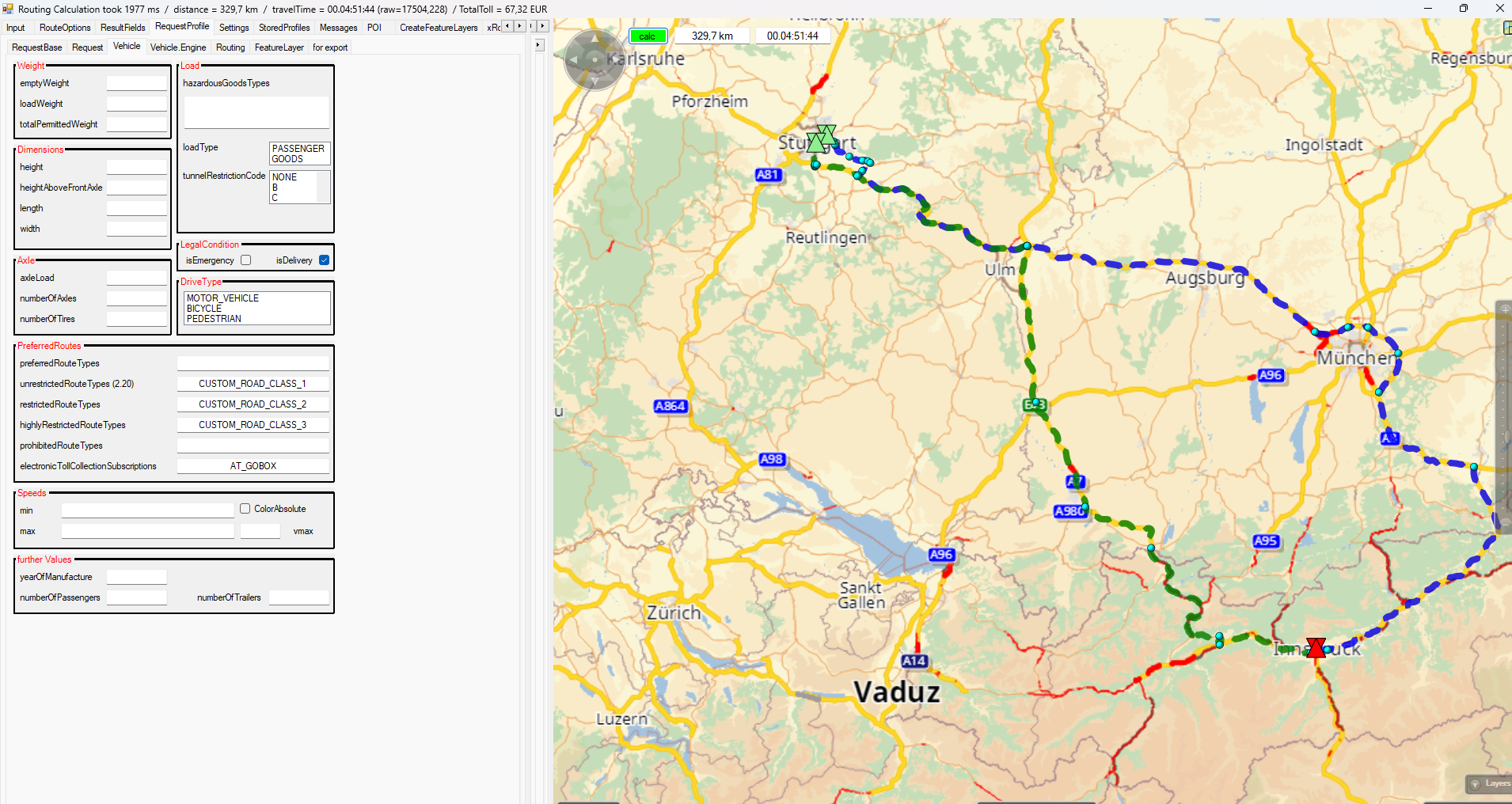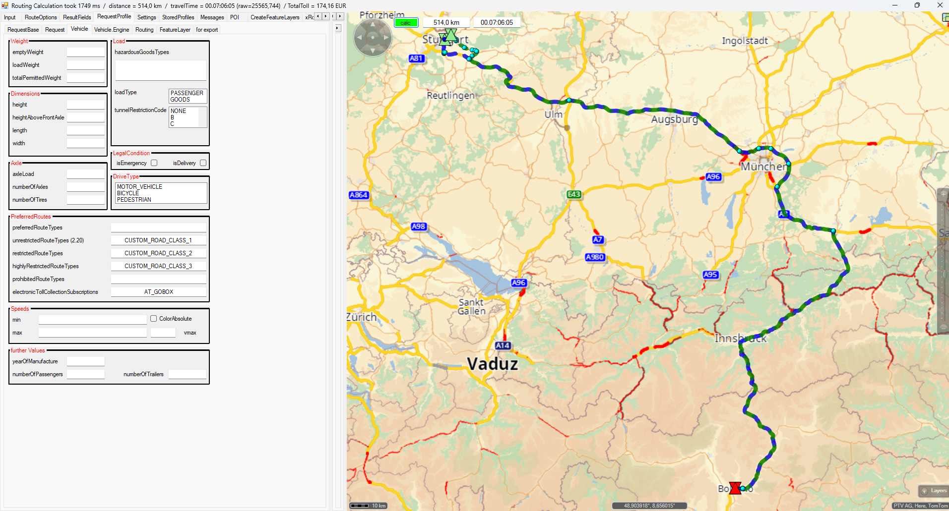 - The underlying request specifies VehicleProfile.LegalCondition.isDelivery=true and requests the PTV_RestrictionZones.