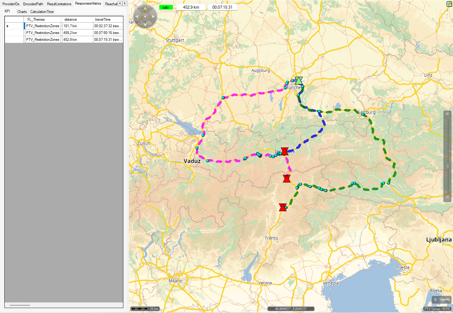 Innsbruck (within the transit zone, therefore allowed to use the A12), Vipiteno and Bolzano (both outside the transit zone, therefore large detours apply).