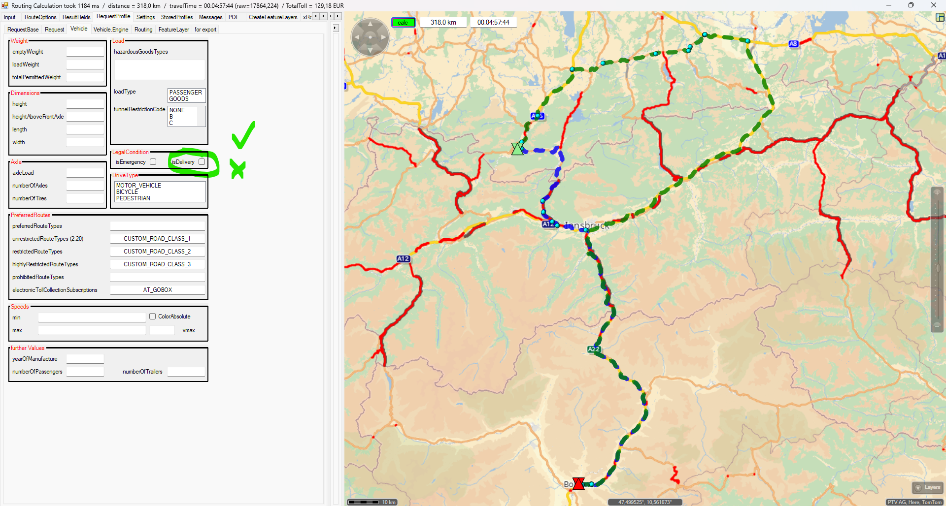 Stuttgart - Innsbruck:<br />if isDelivery==true the route takes a short path via the Fernpass. <br />if isDelivery==false the route takes a detour.<br />Because the delivery is inside te Quell- and Zielverkehr zone.