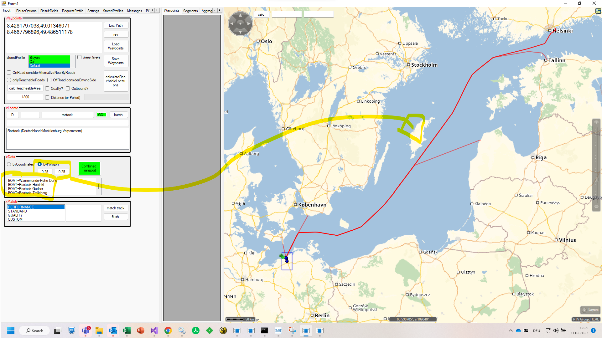 1. The client provides the coordinates of the starting point A and ending point B, for which I get the route using the calculateRoute endpoint from xRoute.