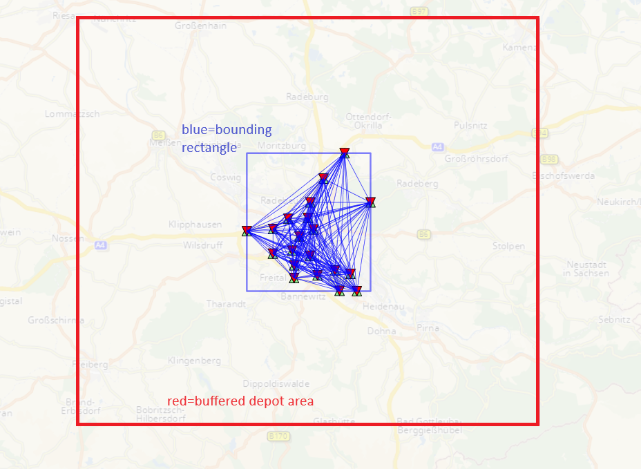 Depot Area : This approach is based on the depot's coodinates and it's assigned location's coordinates. We first compute the bounding rectangle around the involved locations and then add some buffered space around it. For this approach custom search space bounds are required.