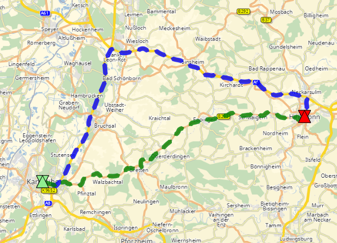 • Best route: this simply means to determine the best geometry between 2 or more waypoints without changing the sequence of the waypoints. The target function may be based on abstract "costs" (xRoute1, check the term MALUS) or monetary costs (derived by direct costs per distance, per time, per fuel and indirect costs such as toll based on vehicle dimensions)