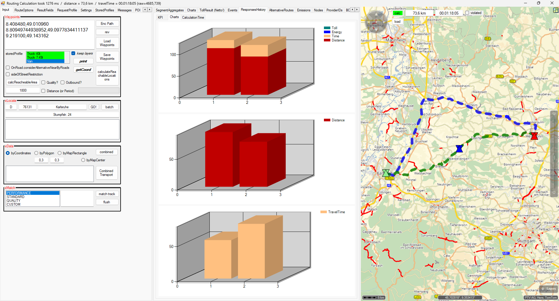 - ZThe blue route i just the route from Karsruhe to Heilbronn with a standard VAN profile. As the focus on distTimeWeight is 80% (prio towards traveltime) the ROUTING decides to go via the highway though this is a detour.