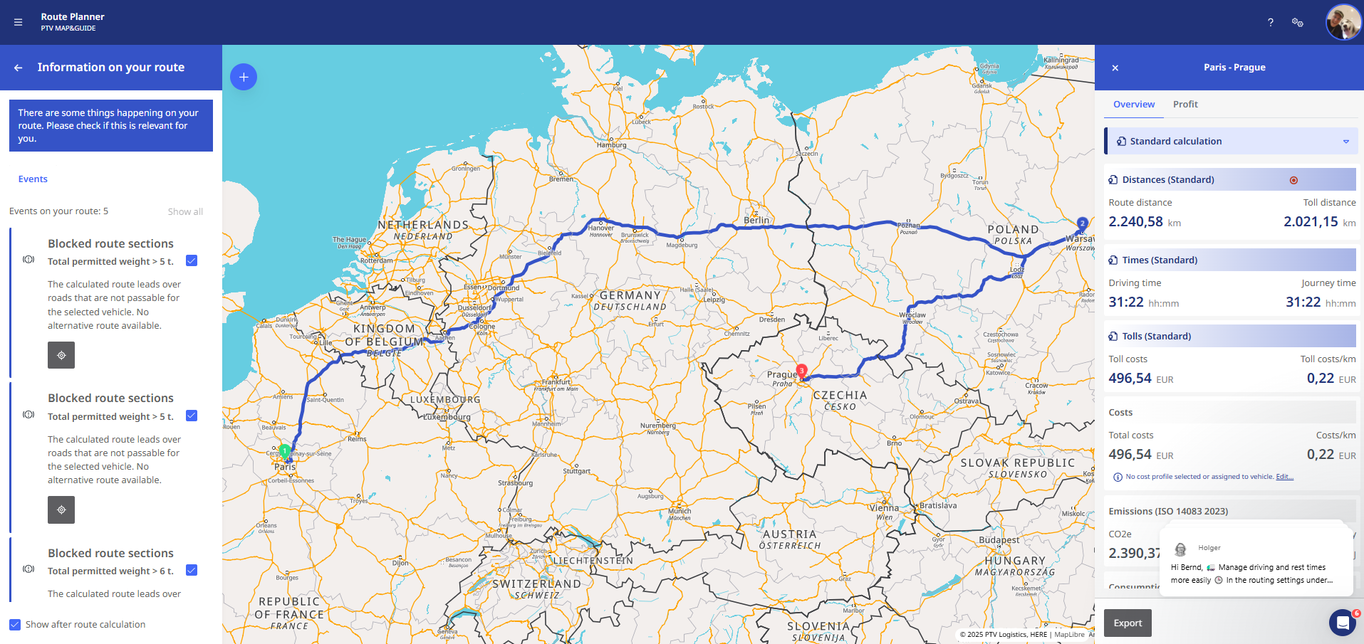 - PTV Developer Routing API for the routing and determination of distance, traveltime, detailed toll, emissions and more
