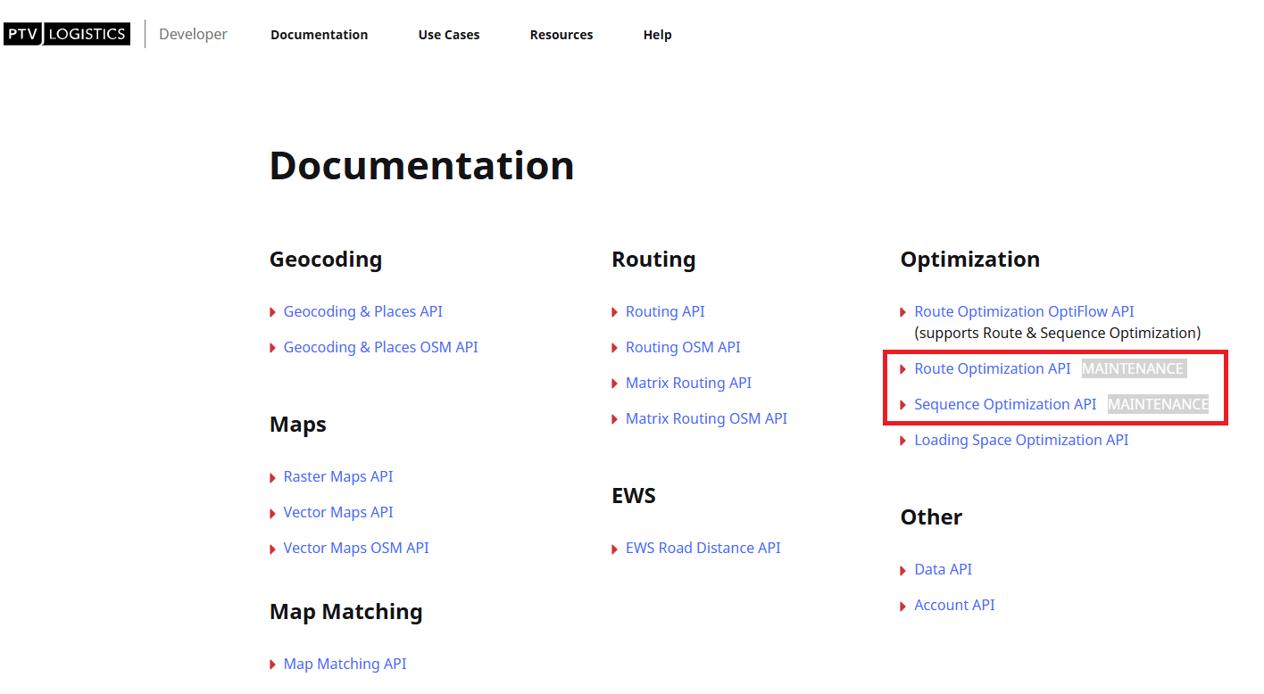 As you can see from this image the Route Optimization API and Sequence Optimization API are labelled as "maintenance" - they will no longer be improved and the focus is clearly on the PTV Route Optimization OPTIFLOW API which has been released somewhere in december 2023.