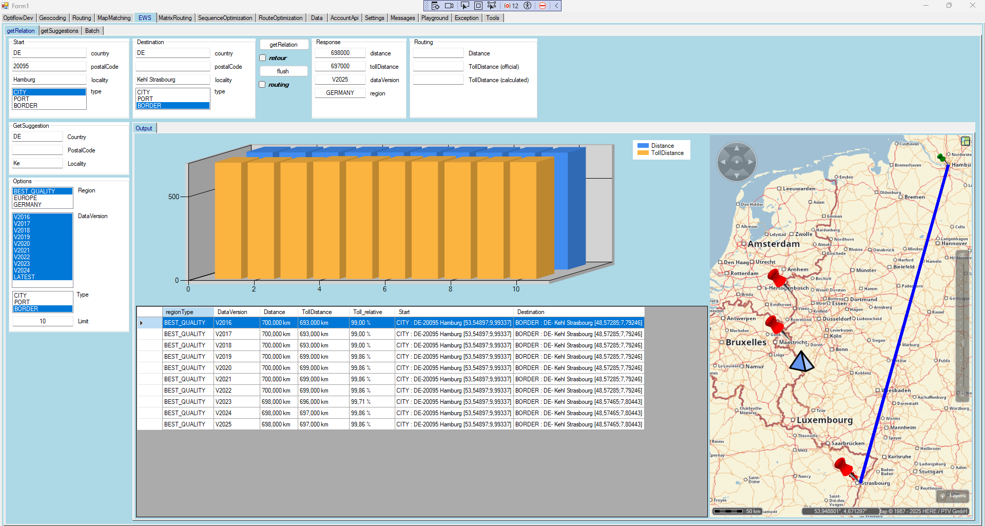 • The stored relation data is based on different annual map versions and so you can gather the reference distance distance in the context of a specific map version, even years after the map was "the actual one". This is important for parties who included the map versions in their contracts with their legal counterparts.