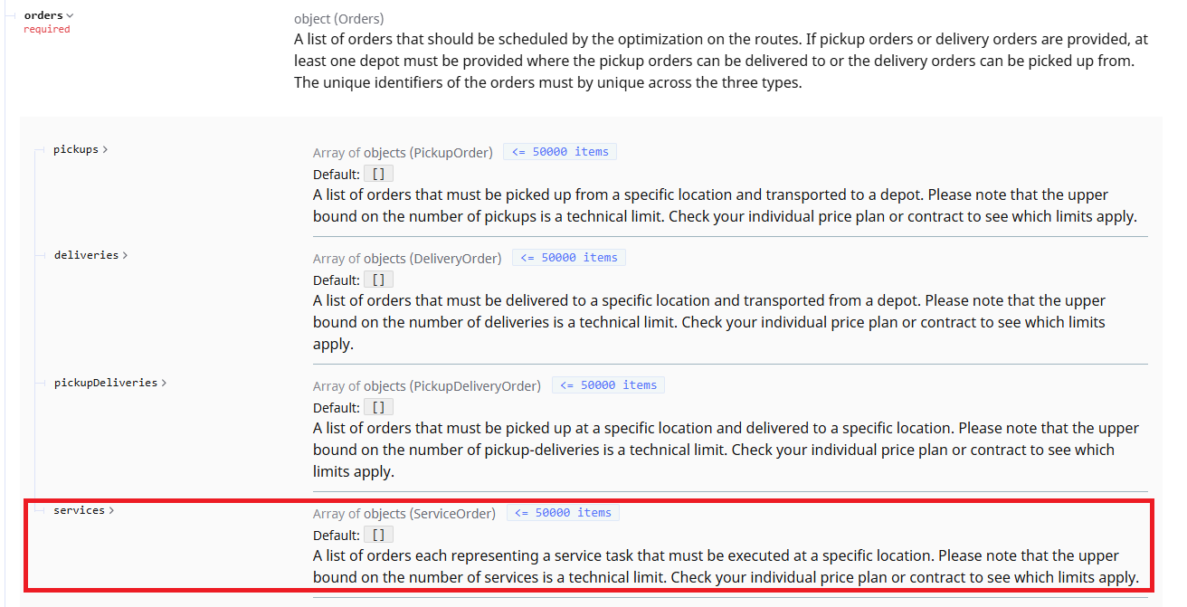 Route Optimization OptiFlow API1.32.0FEATURE05.11.2025Added service orders which represent a single task that should be executed at a specific location.