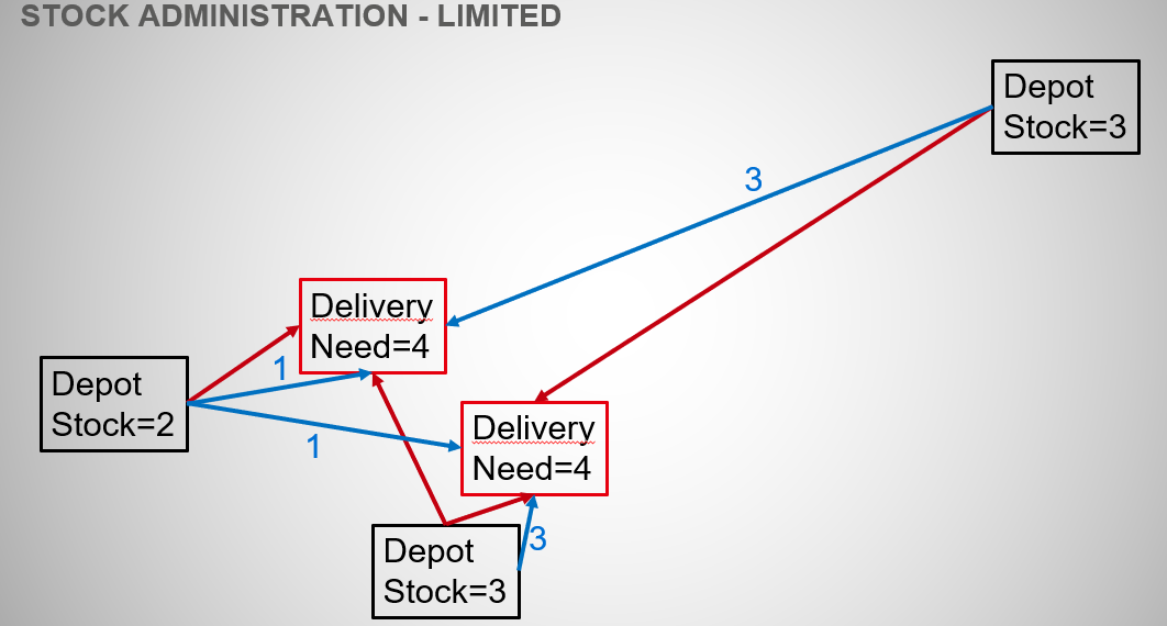 In xTourServer (both xTour1 and xTour2) the amount of stock in a depot is either “infinite” or “empty”. If a destination requires “x” pieces of what soever I usually define the depots that are “infinite”. Assignment is more or less simple if we do not have to face additional topics such as timeslots. But here's the challenge: What if the amount of palettes at the depots is limited? E.g. because