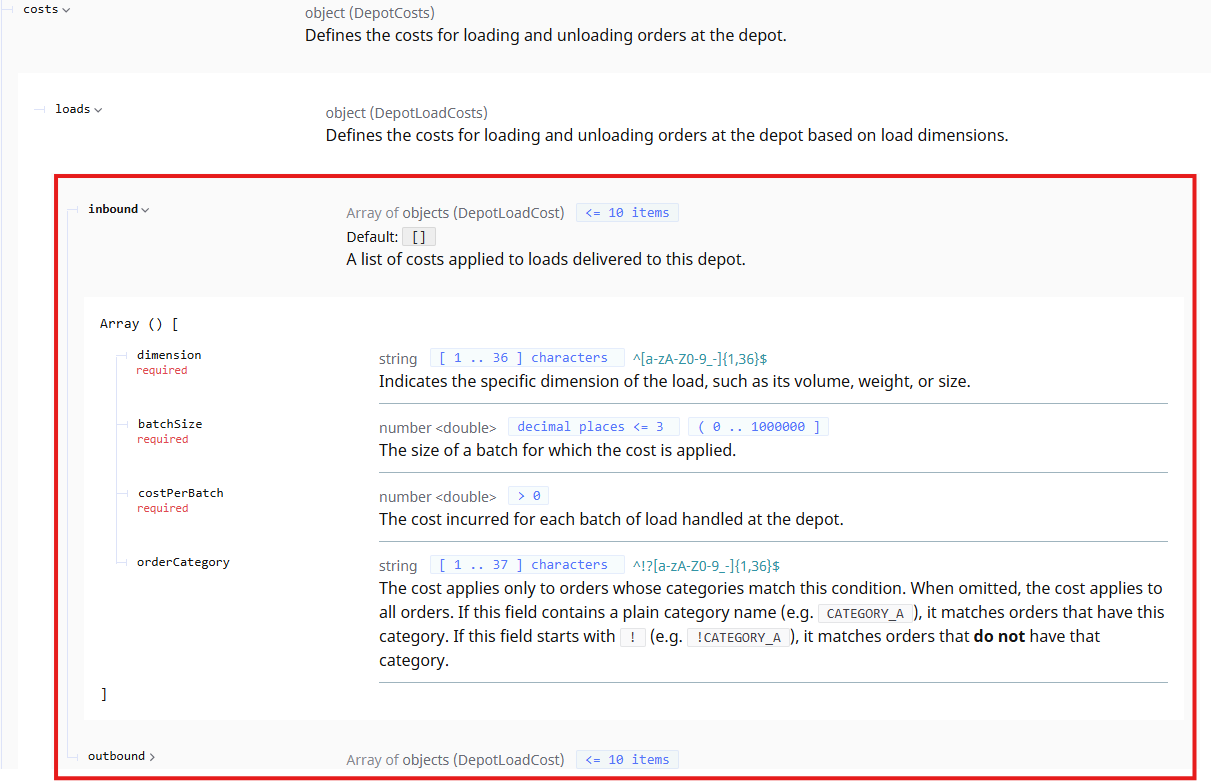 - .costs.loads:(v 1.55 / 20.3.2026) - inbound (A list of costs applied to loads delivered to this depot) and outbound (A list of costs applied to loads picked up at this depot) - Defines the costs for loading and unloading orders at the depot based on load dimensions: