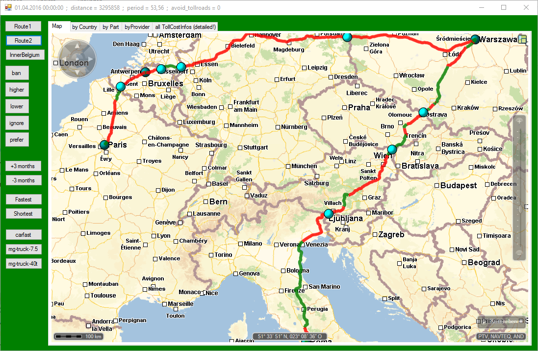 Sample route with several stations and through several countries