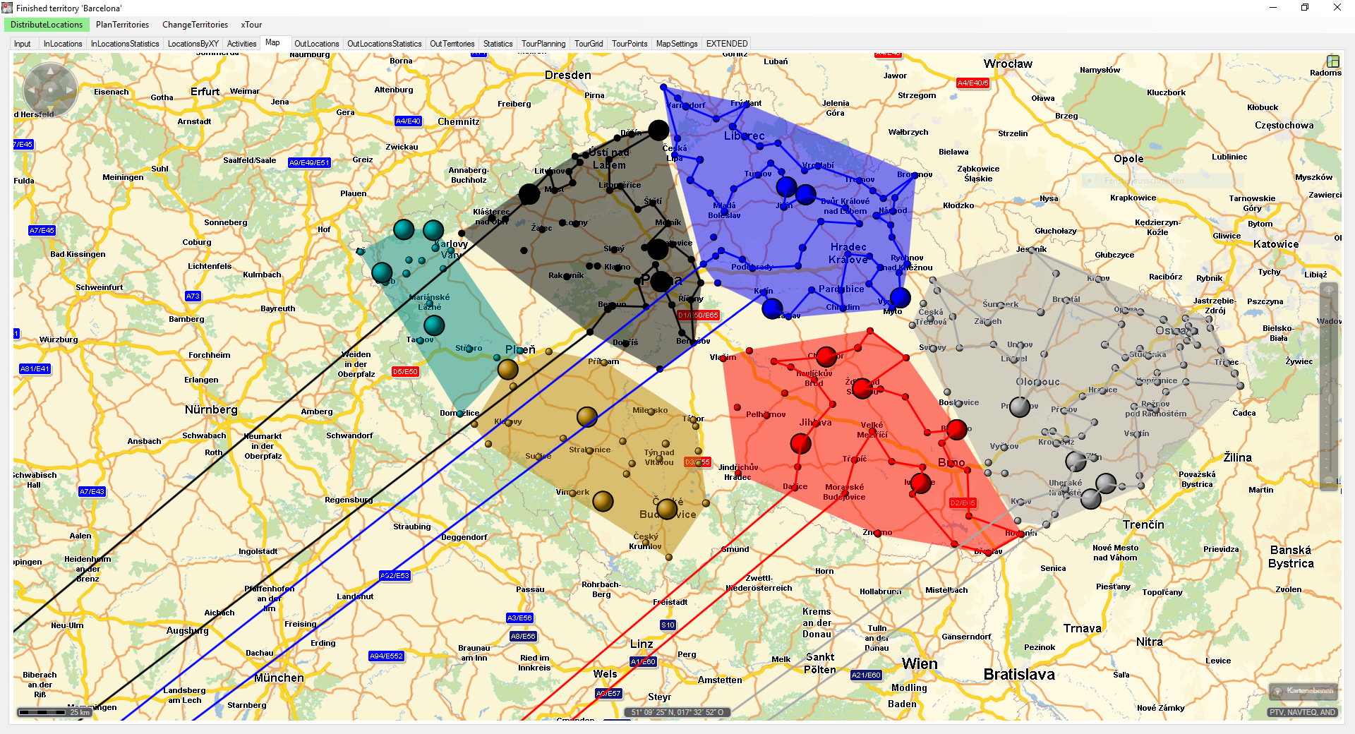 overall visualization of 6 sales reps and their 6 service areas. Sevilia/Malaga are even further away from the simulated czech customers than the sales reps in Barcelona and Zaragoza.
