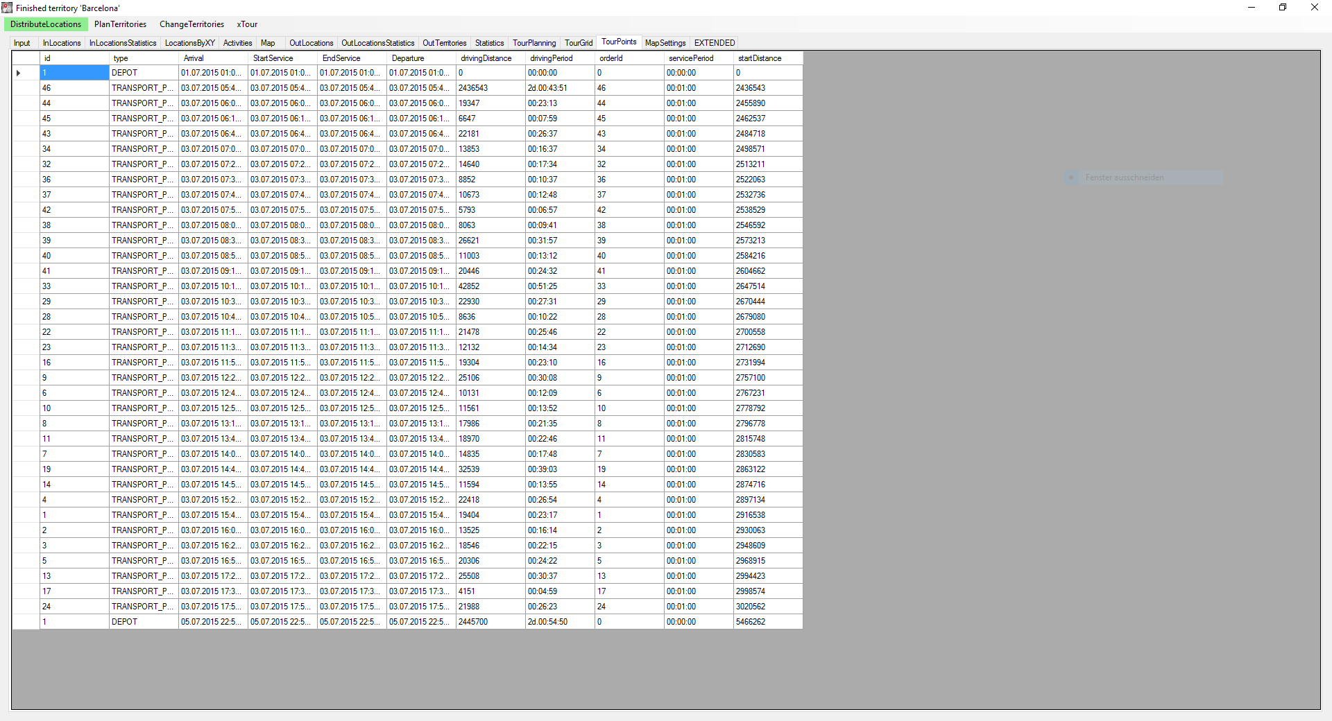 Here is the schedule for the BARCELONA sales rep (grey). As you can see in the second row the transfer from Barcelona to the grey area requires more then 2 days of driving so there is only a slim budget of time available for the WEDNESDAY visits.<br />I achieved this by setting the costs per unscheduled customer to a very high value (100000) while the costs per distance / period are rather low (1).