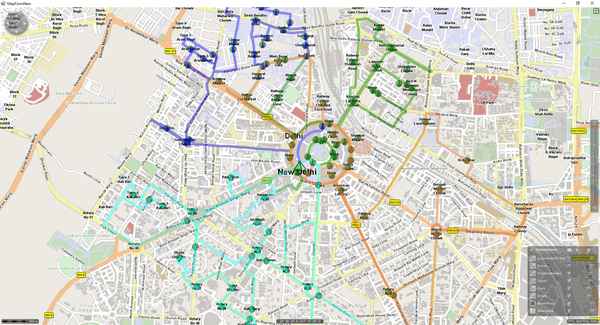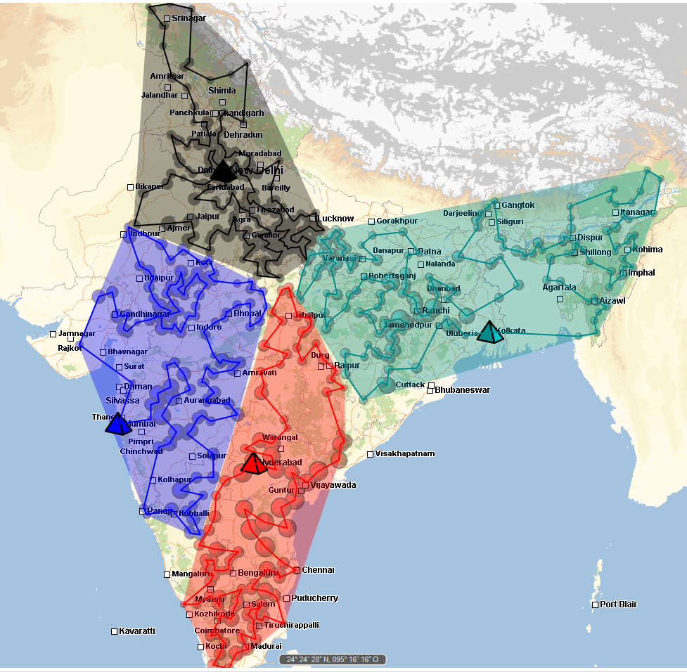 Code sample demonstrating balanced tour optimization in the city of New Delhi. Several trucks delivering goods to about 100 destinations.