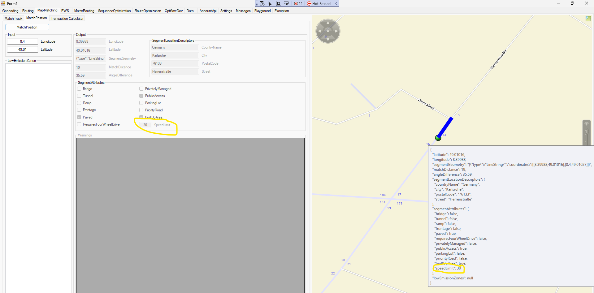 Meanwhile the MapMatching API in PTV Developer offers to return SpeeedLimits on a segments "matchedPosition".
