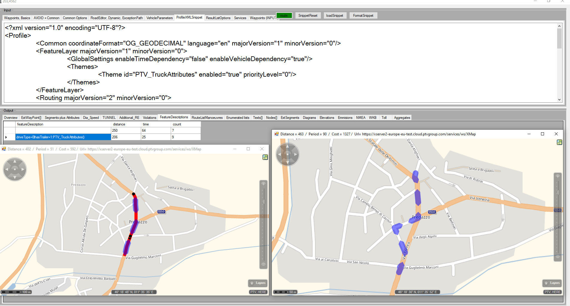I've been asked how to enforce a vehicle to performa a detour around streets with the feature "driveType=0|hasTrailer=1:PTV_TruckAttributes()" which means "forbidden for trucks with a trailer".