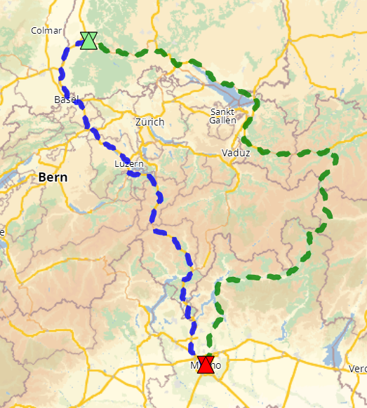 Route from Karlsruhe / Germany to Milano / Italy.<br />Green: forbiddenCountries=[&quot;CH&quot;], <br />Blue: no restrictions set
