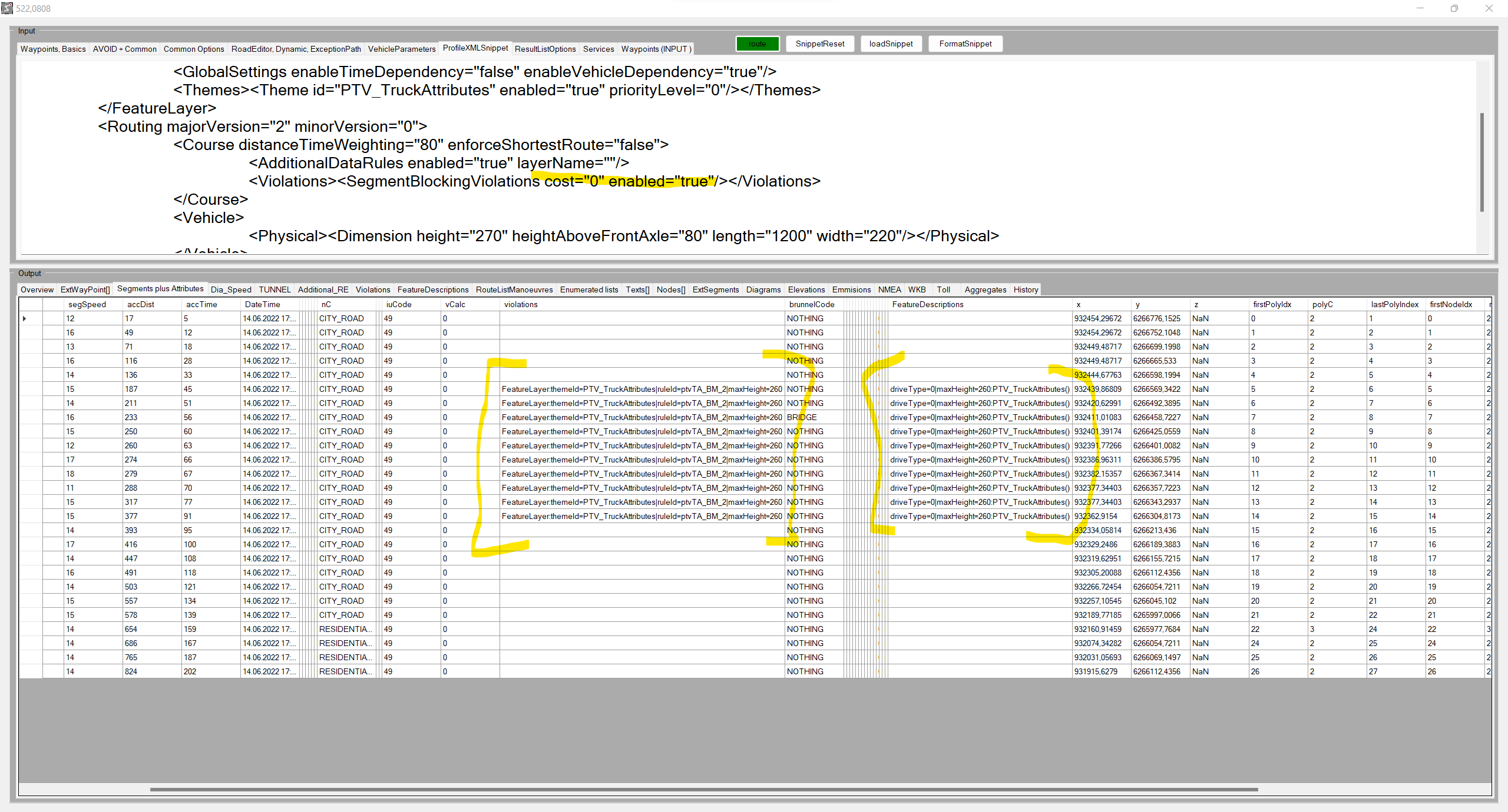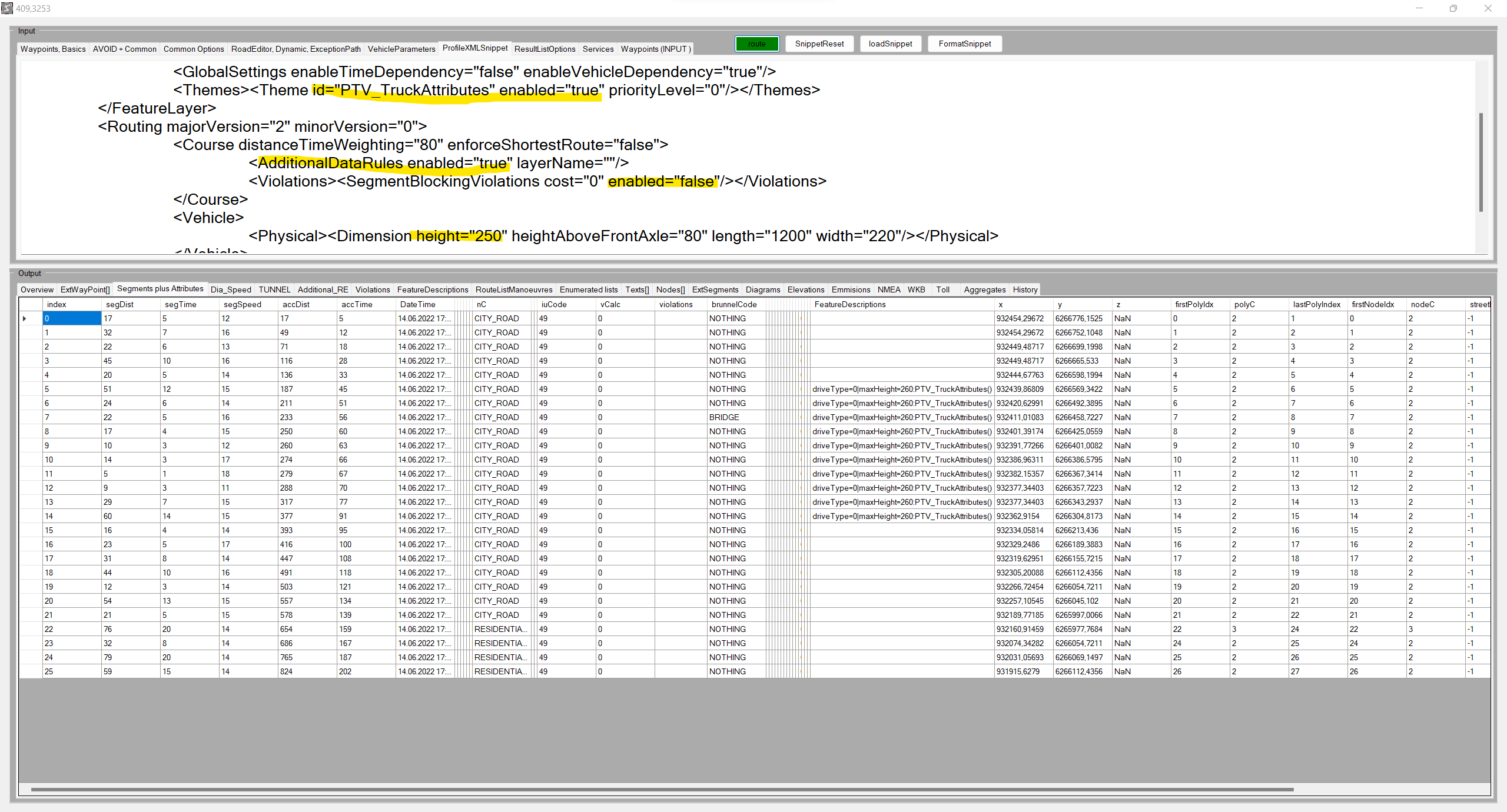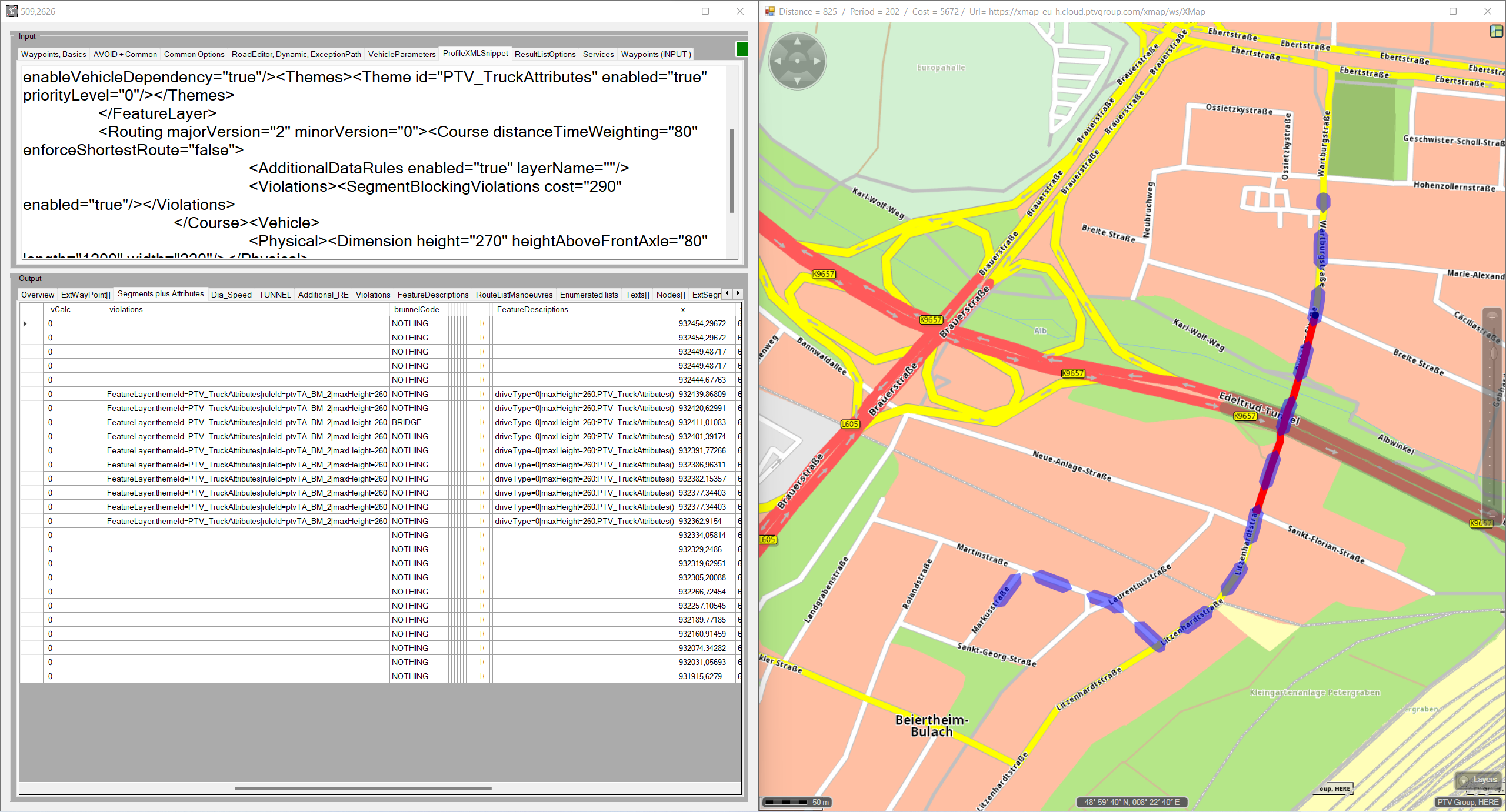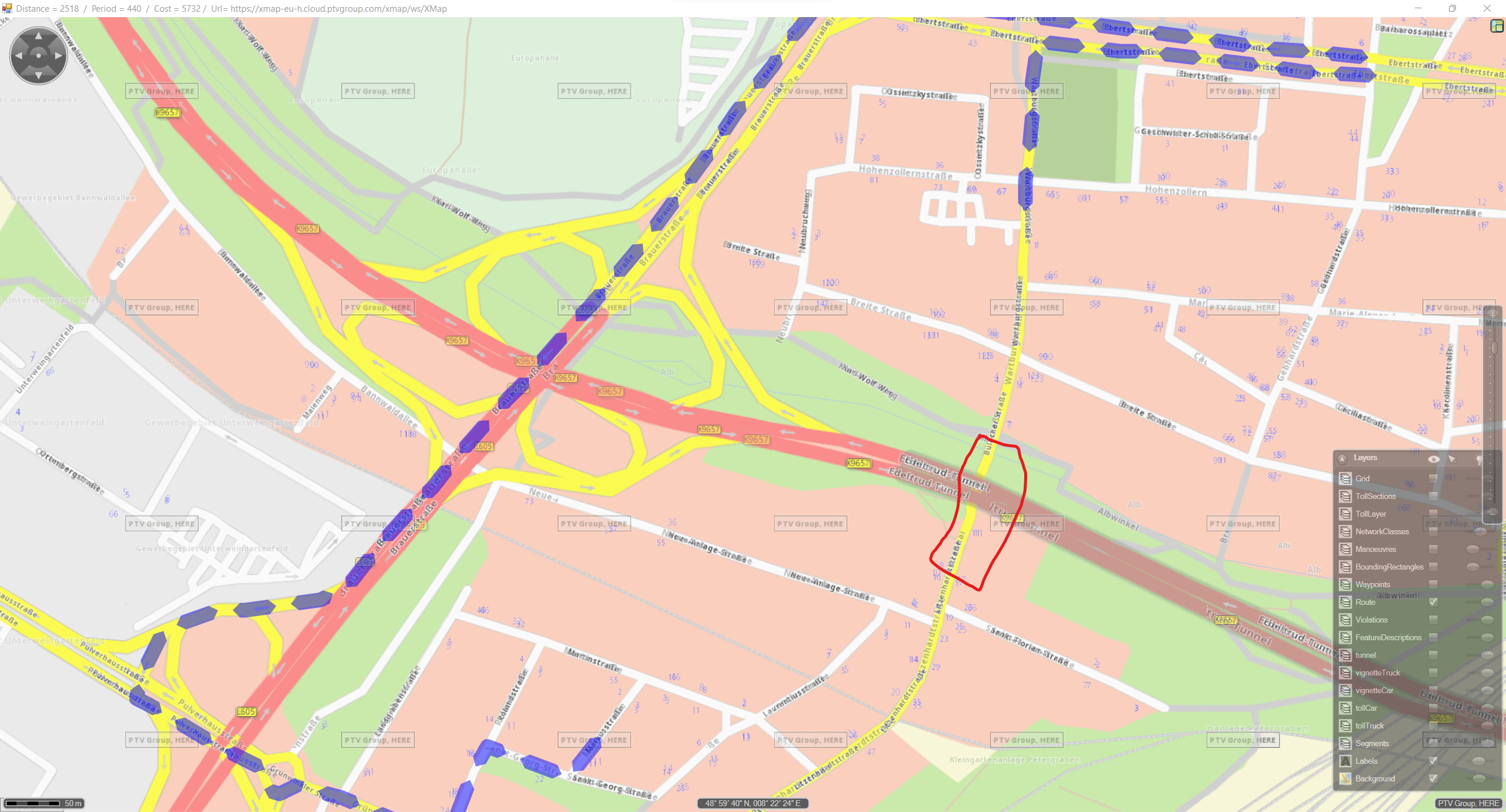 Let's start with a simple route through Karlsruhe. Important to know: the original track uses a few (10) segments with a height restriction of 2.60m (PTV_TruckAttributes) - a tunnel under the Südtangente. The used car in the initial scenario has a height of 2.50m and is therefore allowed to use these segments.