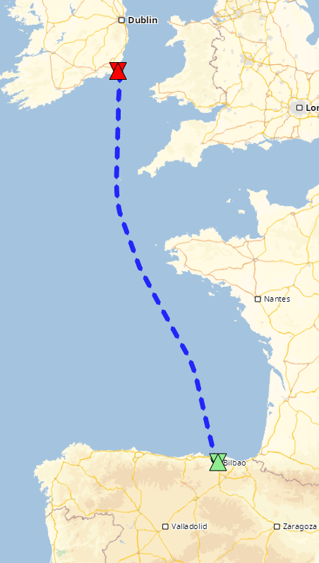 I assume you refer to the current TOMTOM map (https://xroute-eu-n.cloud.ptvgroup.com/xroute/ws/XRoute). At least the HERE map shows a connection between Bilbao/Algorta and Rosslare. (CHeck Screenshot below)