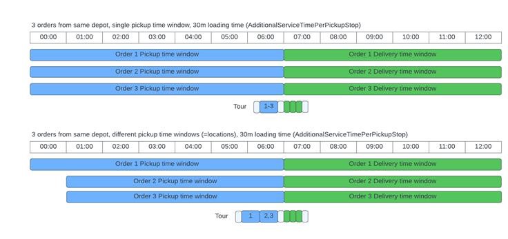 I'd like to model delivery of orders from a single depot with predefined service time for pickup (30 minutes AdditionalServiceTimePerPickupStop, 0 minutes per order) where orders have different pickup time windows. I created a DepotSite for each of the different opening intervals and as long the pickup time windows are overlapping, the orders are delivered on the same tour which is great, but the service time on pickup from depot is calculated for each of the windows:
