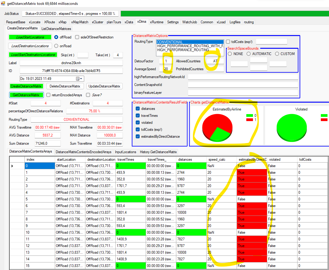 A sample 4x4 matrix output: the waypoints are in Germany but the allowedCountries are restriced to Austria. Therefore the routings performed a fallback to airline. WHich can be seen in the "estimatedByDirectDistance" column