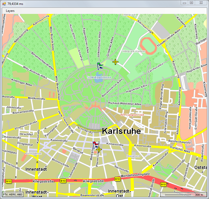 The default value for the search distance is 5000m. In most cases this is a sufficient distance. In the given scenario the route is successfully computed and looks like this: