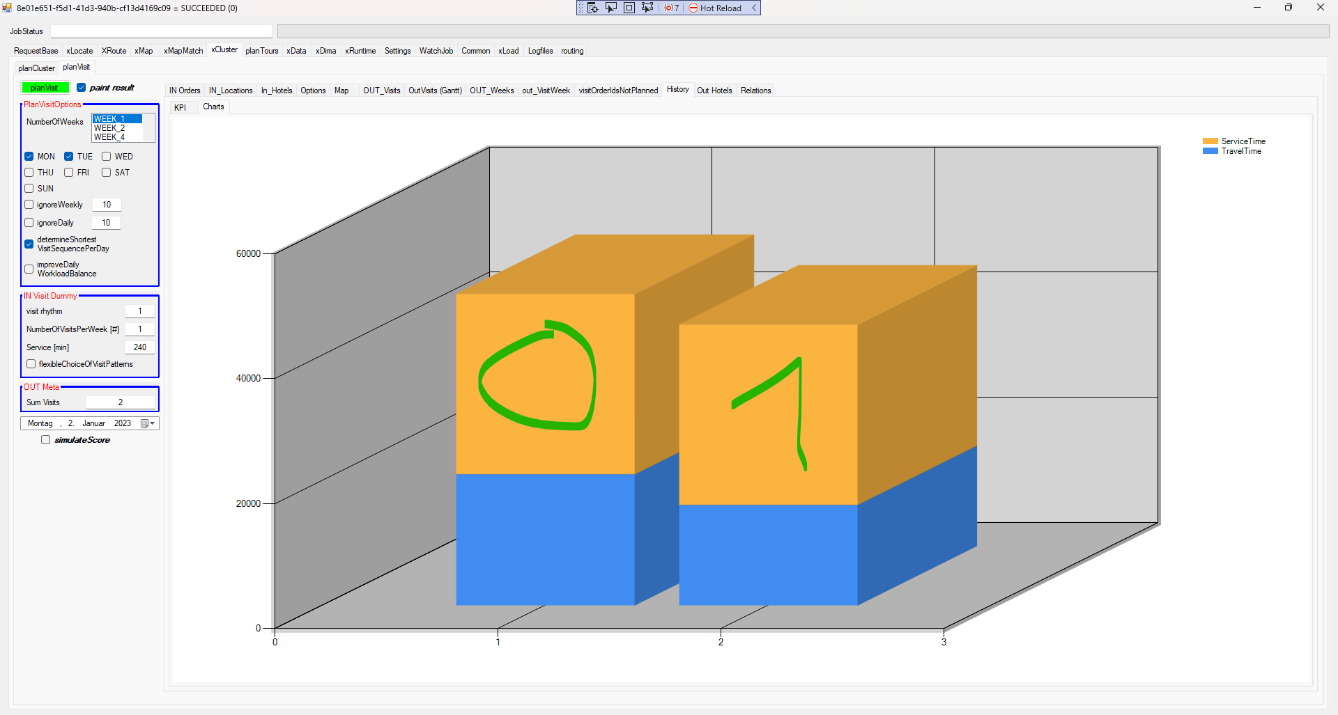 - Here's the direct comparison. By staying in the hotel it is pssible to save about 1:30 traveltime - with equal service times for both scenarios.