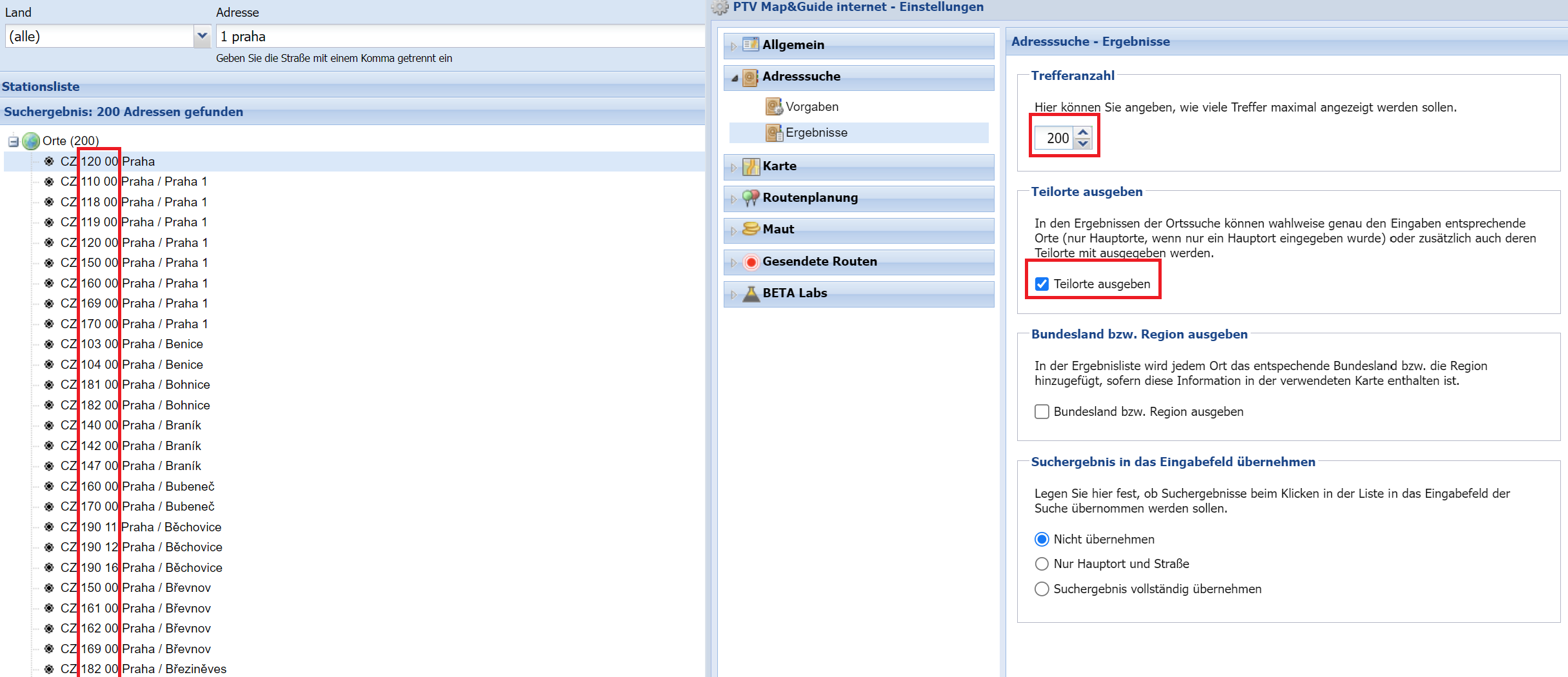 But when we enter the same string in Map&Guide Internet we receive a lot more than 19, depending on the settings made: