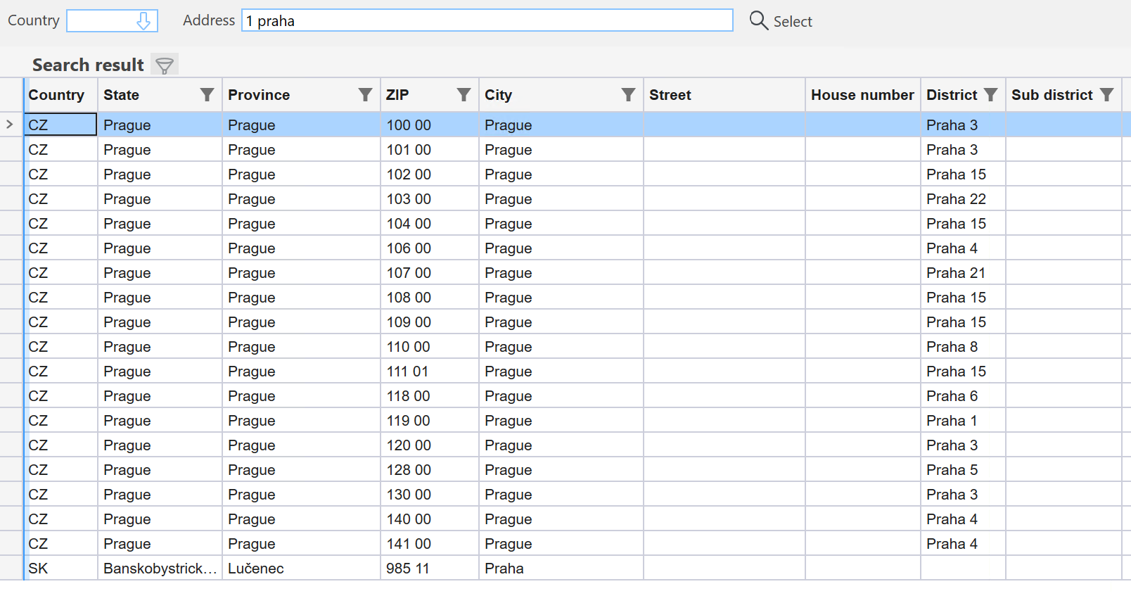 When entering the string "1 praha" we get 19 result rows:
