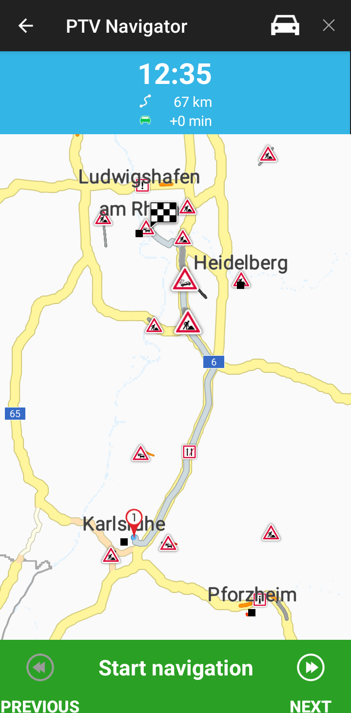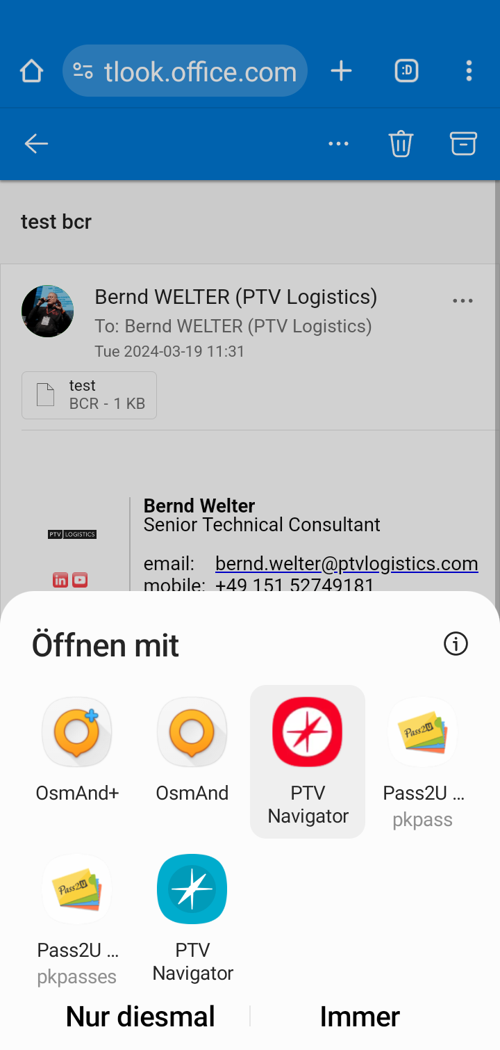 | Send the BCR file as an attachment via email... Try to open it on the mobile device... Select the PTV Navigator from the list of apps that are assigned to *.BCR files | ||