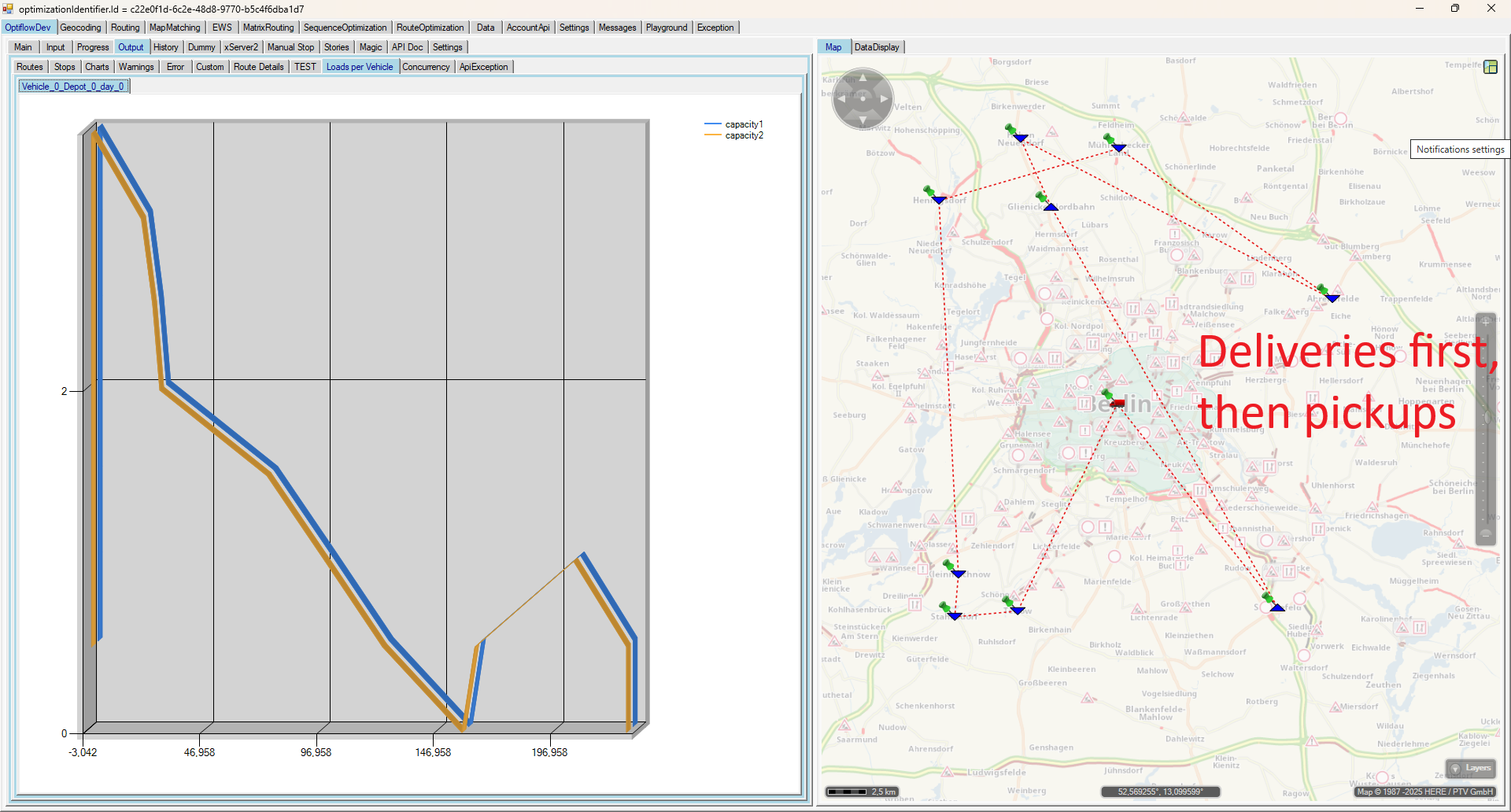 Usecase requirements: all deliveries (triangles down) are supposed to be served before the pickups (triangle up) are handled.