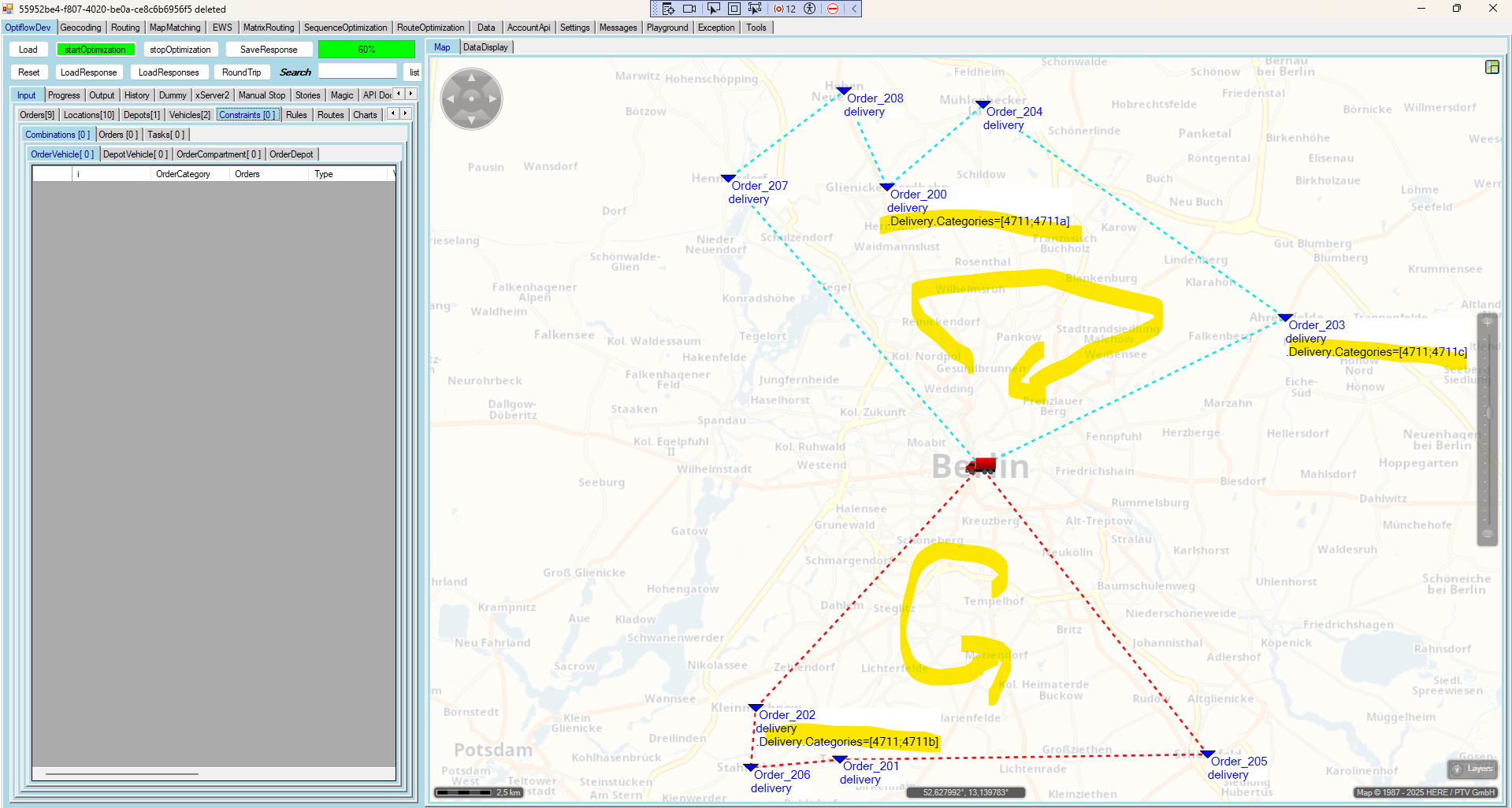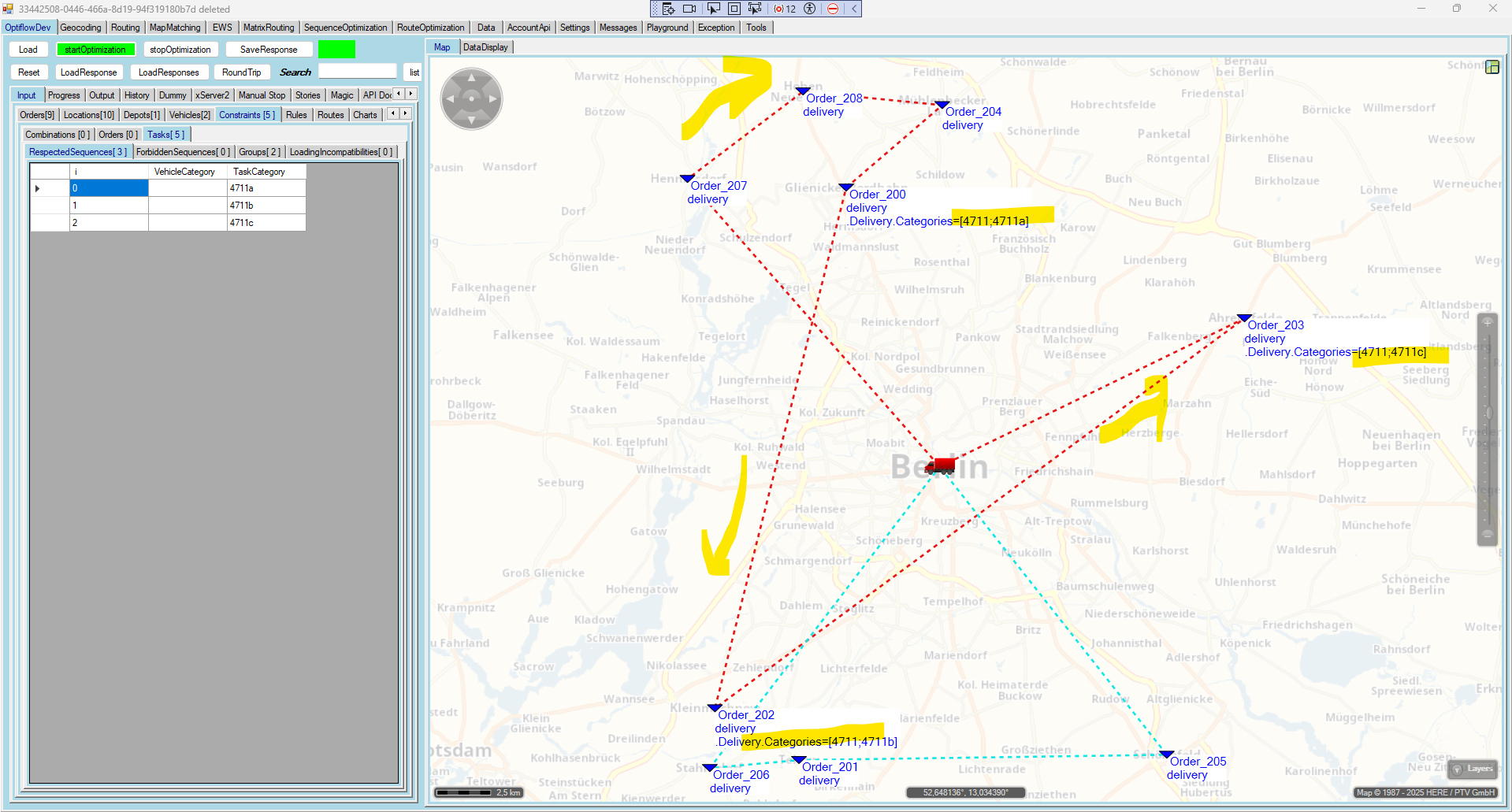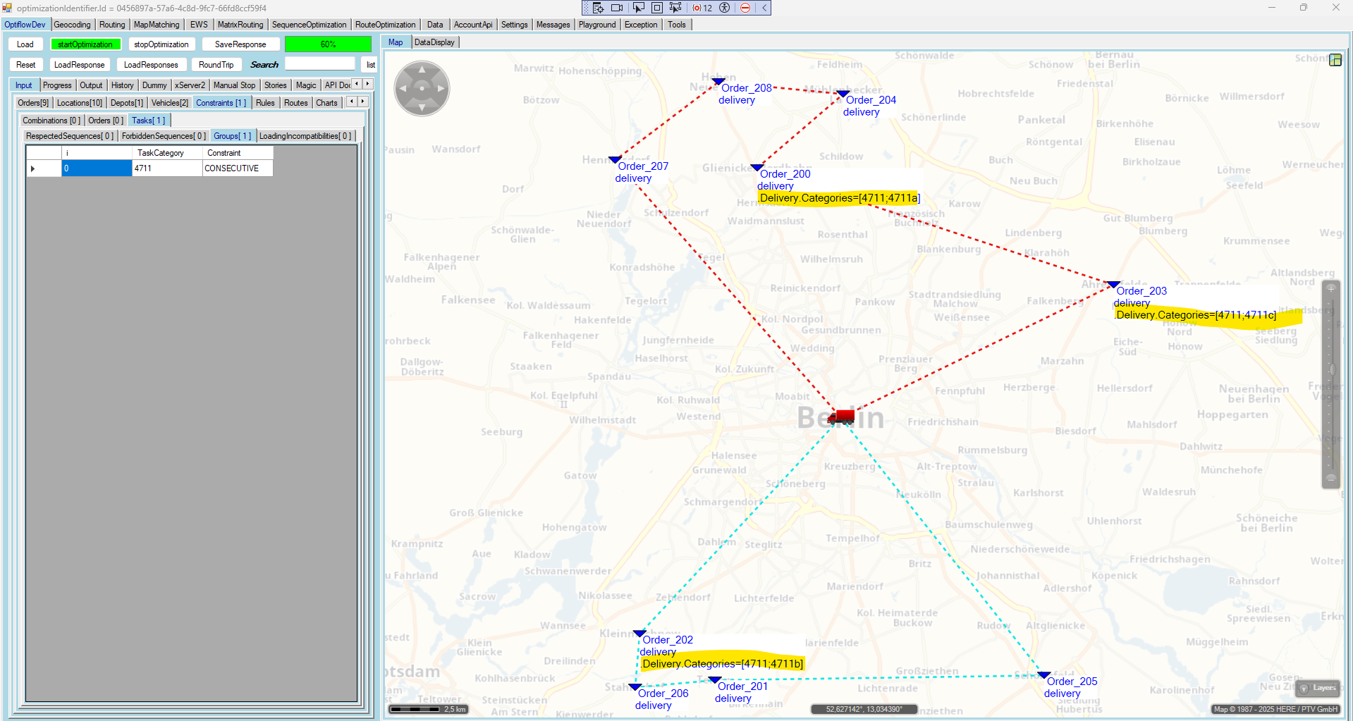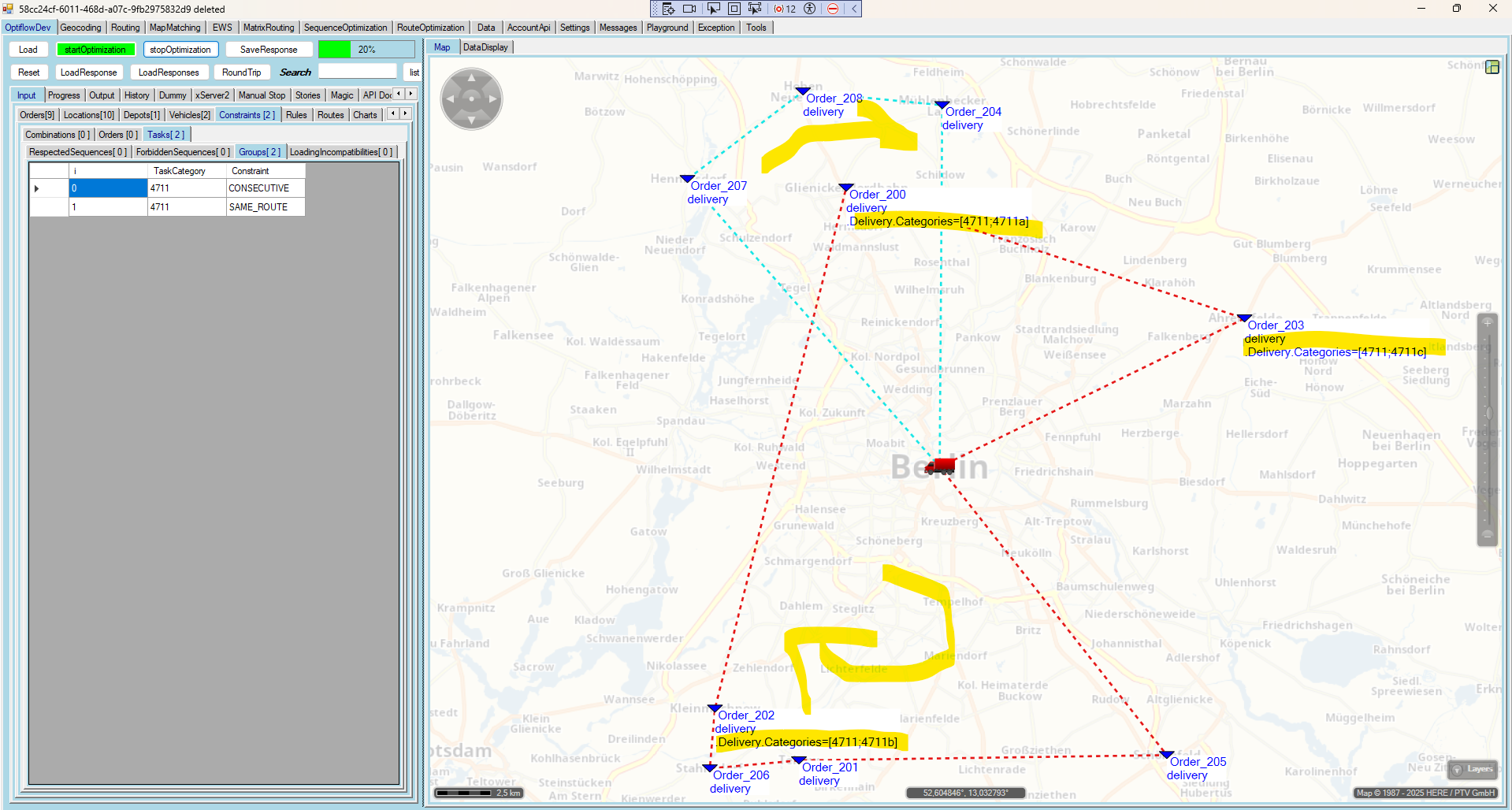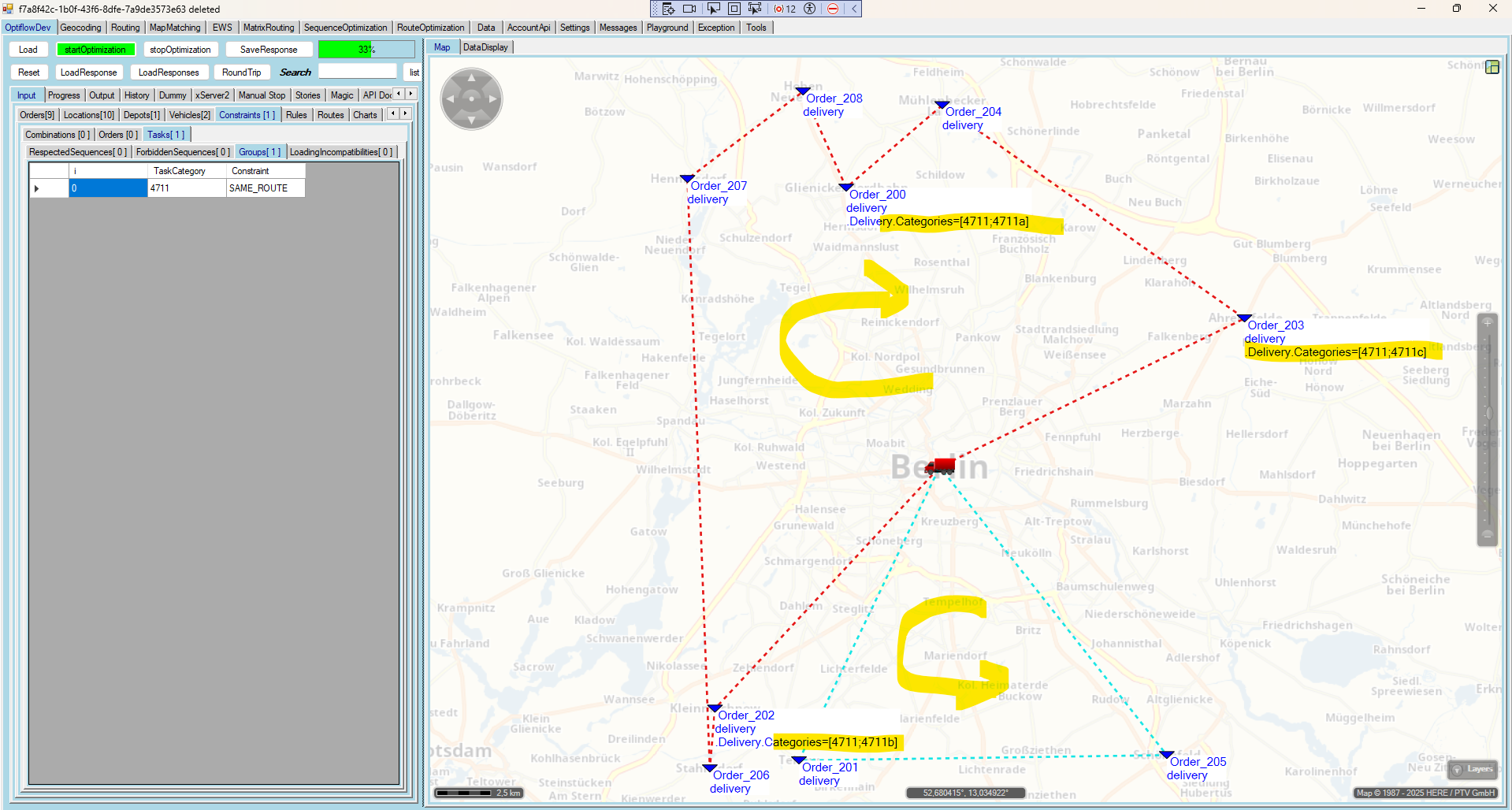 "constraints": { "tasks": { "groups": [ { "taskCategory": "4711", "constraint": "SAME_ROUTE" } ] } } - If I use CONSECUTIVE instead of SAME_ROUTE then it is ensured that the prepackaged orders on the same route are not interrupted by tasks not belonging to that group.