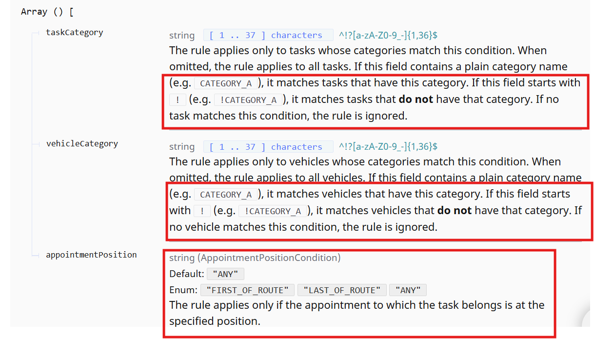 | Route Optimization OptiFlow API | 1.50.0 | FEATURE | 06.03.2026 | Added support for negating categories in various constraints and rules, providing more flexible category-based filtering. |