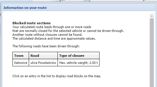 In a PTV Map&Guide internet there is a pretty nice info about route called "Blocked route section".