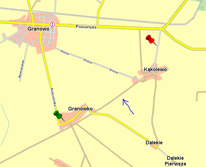 The calculated route leads through a dirt road, which is painted in the map with brown color