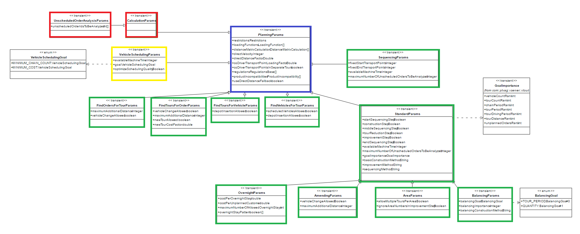 Another important constraint: orders with different AreaIDs are not allowed on the same tour. In other words: each tour is based on a specific AreaID and only accepts orders with that ID or with an empty AreaID. If a single tour is not able to handle the complete Area (due to capacities or max number of stops within a tour) there might be several tours dealing with that Area depending on allowMultipleToursPerArea flag. If that flag is disabled but one tour isn't sufficient some orders remain unscheduled. - VehicleSchedulingParams: Inputplan required, doesn't create new tours but could concatenate existing tours to larger chain.