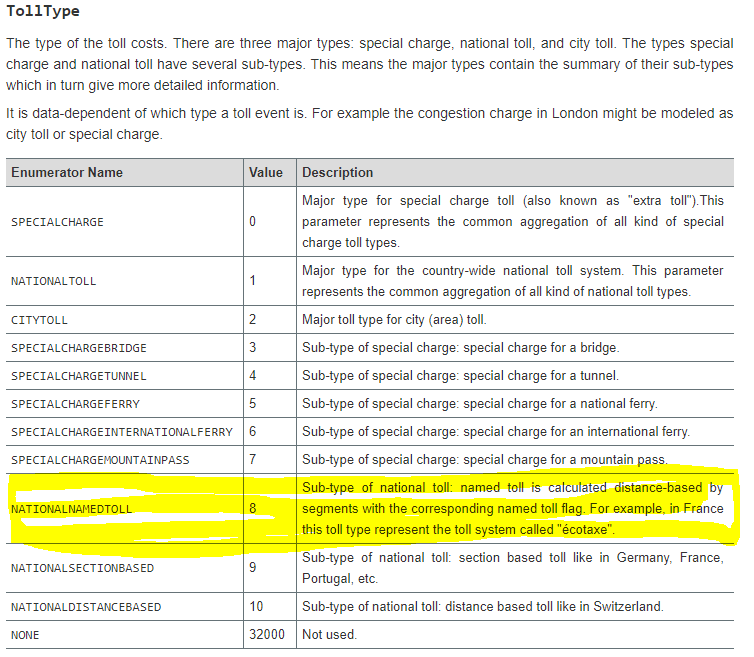 Overview of the available enum TollType