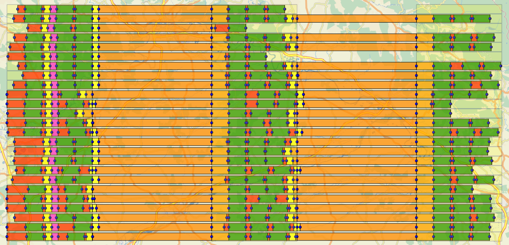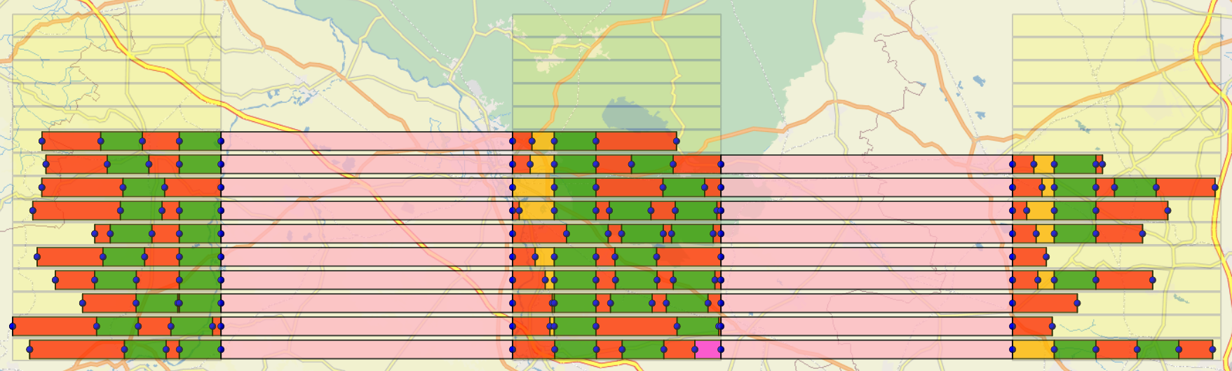 Gantt chart with break- and rest rules. Therefore you can see additional breaks (e.g. yellow: 45 mins somewhere between 11:00 and 13:00). Furthermore the end of the tour is GREEN which shows a half open tour (ends at customer)